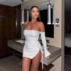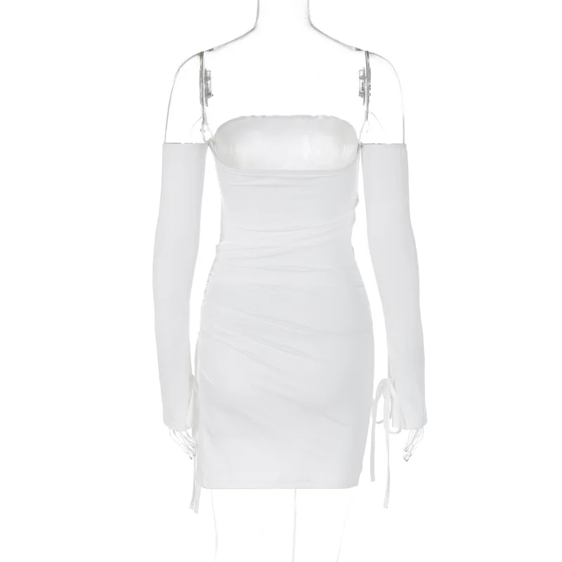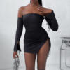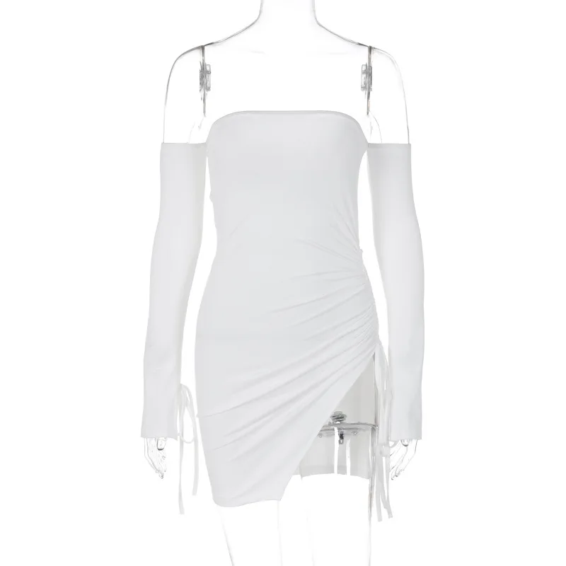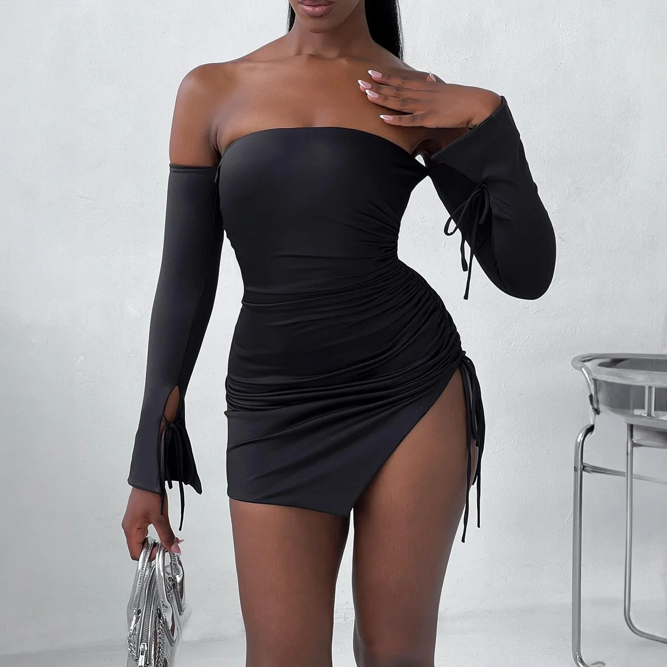 Fleepmart Off Shoulder Ruched Drawstring Split Mini Elegant Women Party Club Bodycon Short Dress