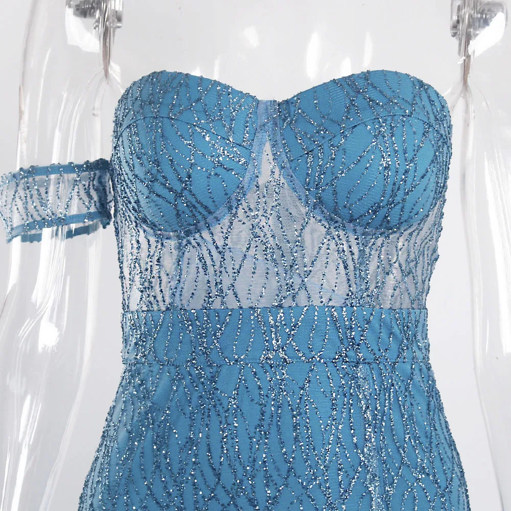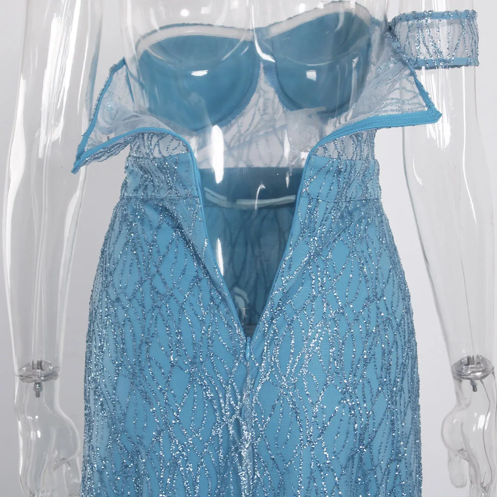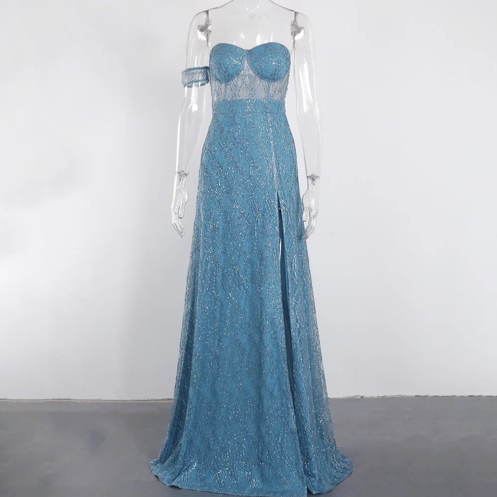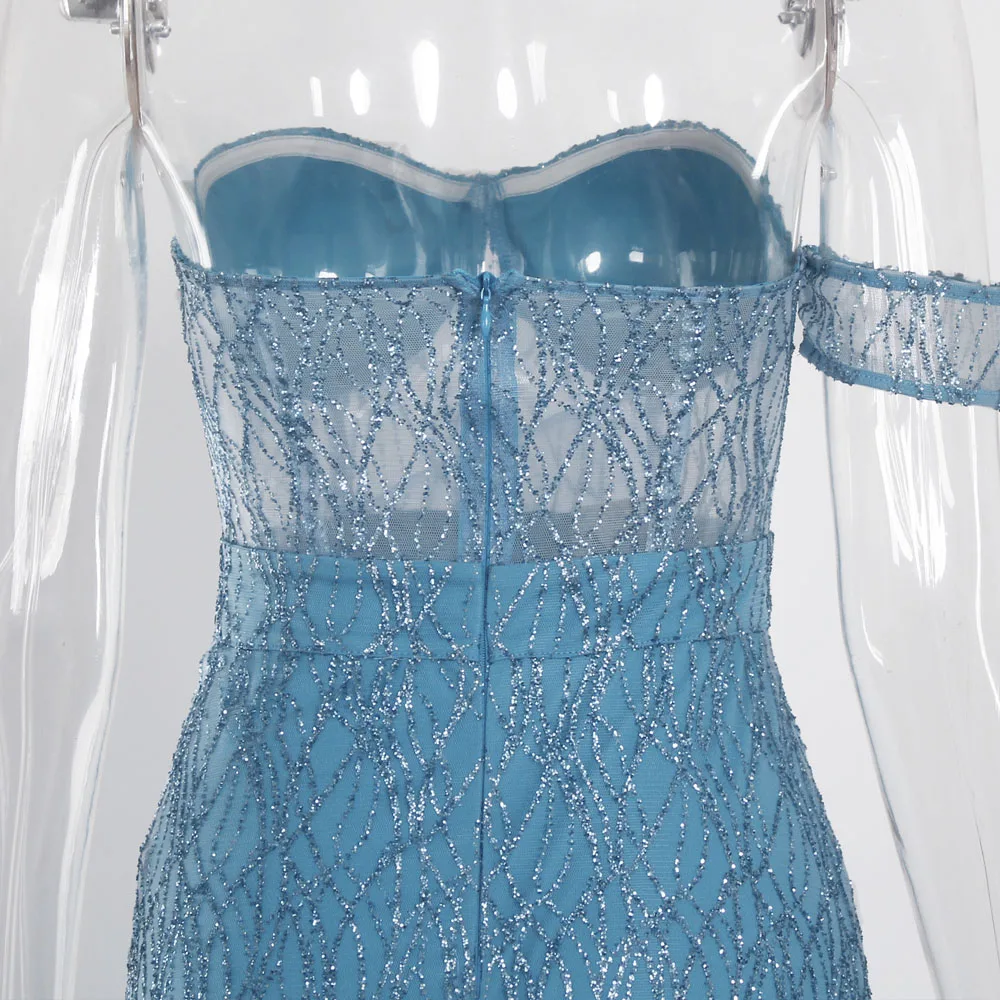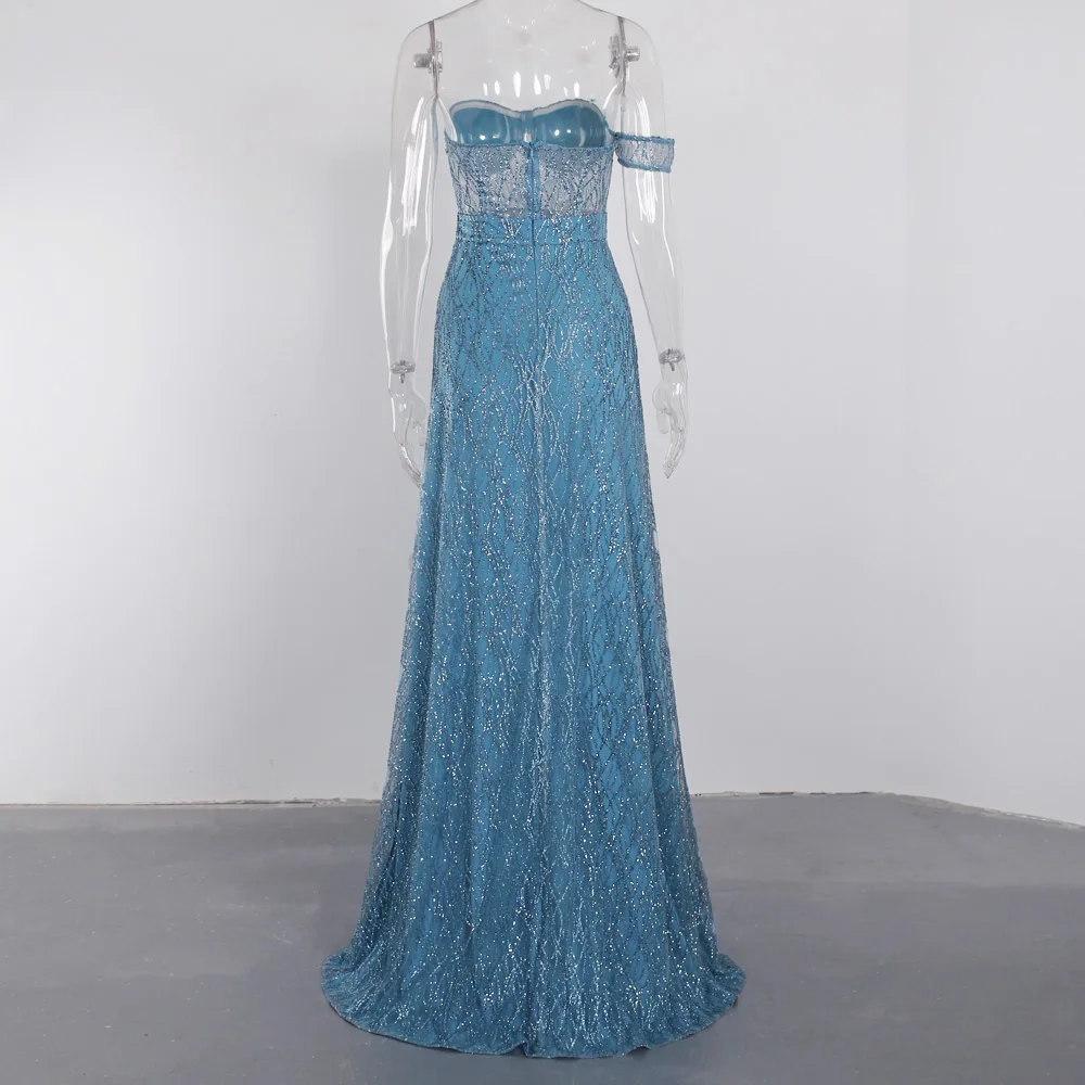fleepmart Off Shoulder sparkle Bling Bling Glitters Floor Length Split Party Dress Full Lining Padded Backless Long Black Dress