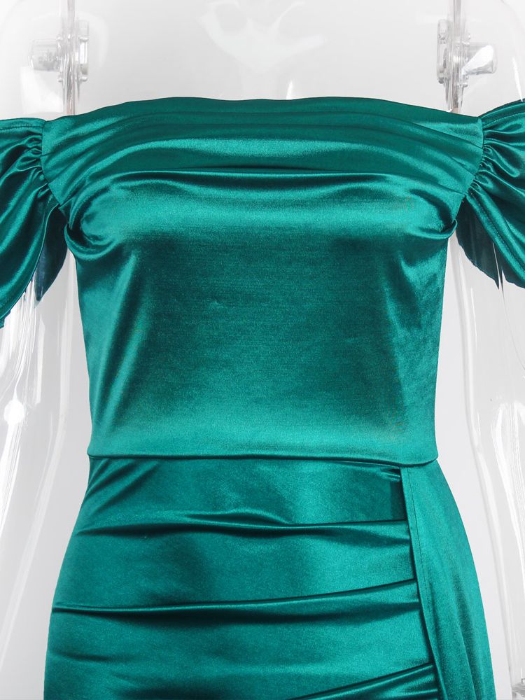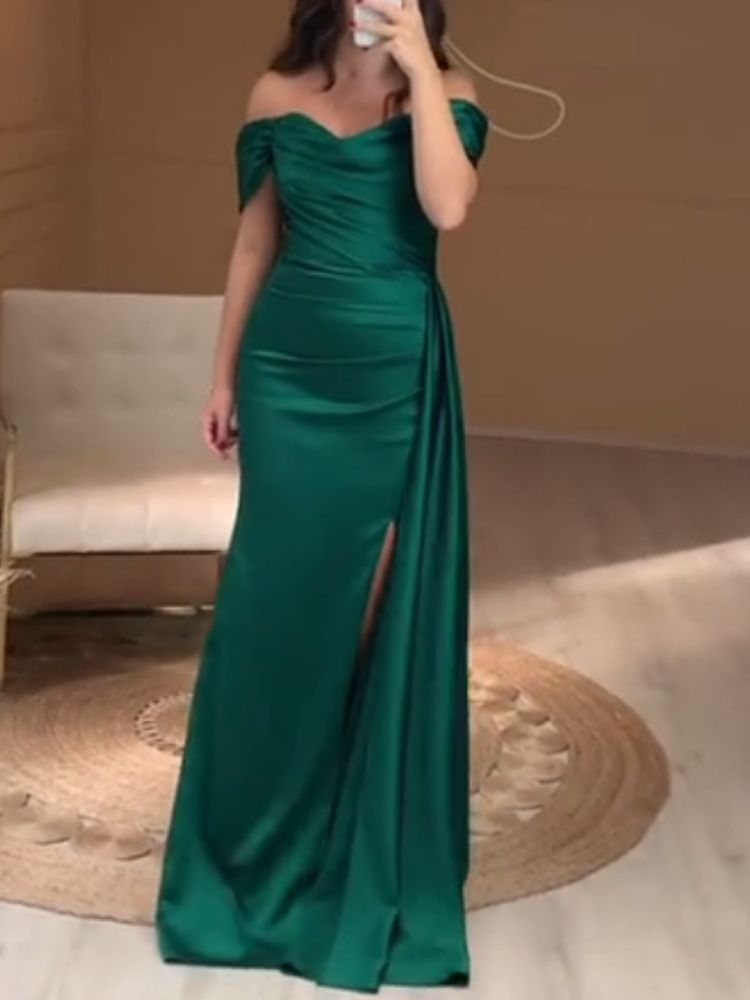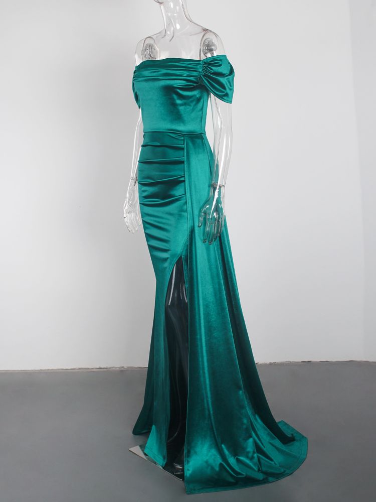 Fleepmart Off the Shoulder Ruched Long Satin Maxi Dress with Ribbon Formal Pleated Leg Split Prom Gown