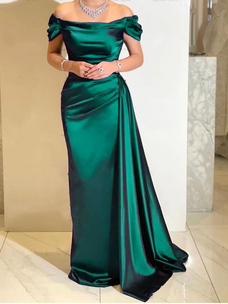 Fleepmart Off the Shoulder Ruched Long Satin Maxi Dress with Ribbon Formal Pleated Leg Split Prom Gown