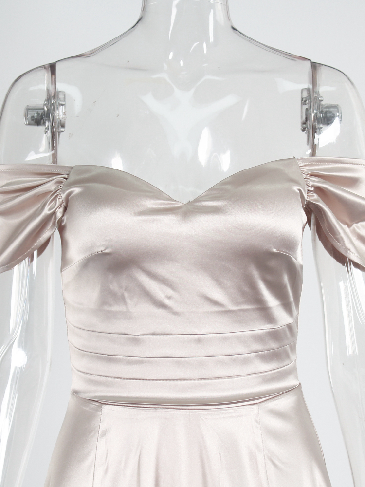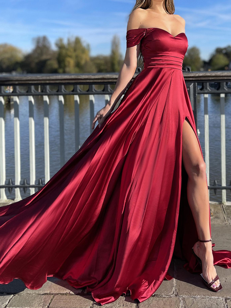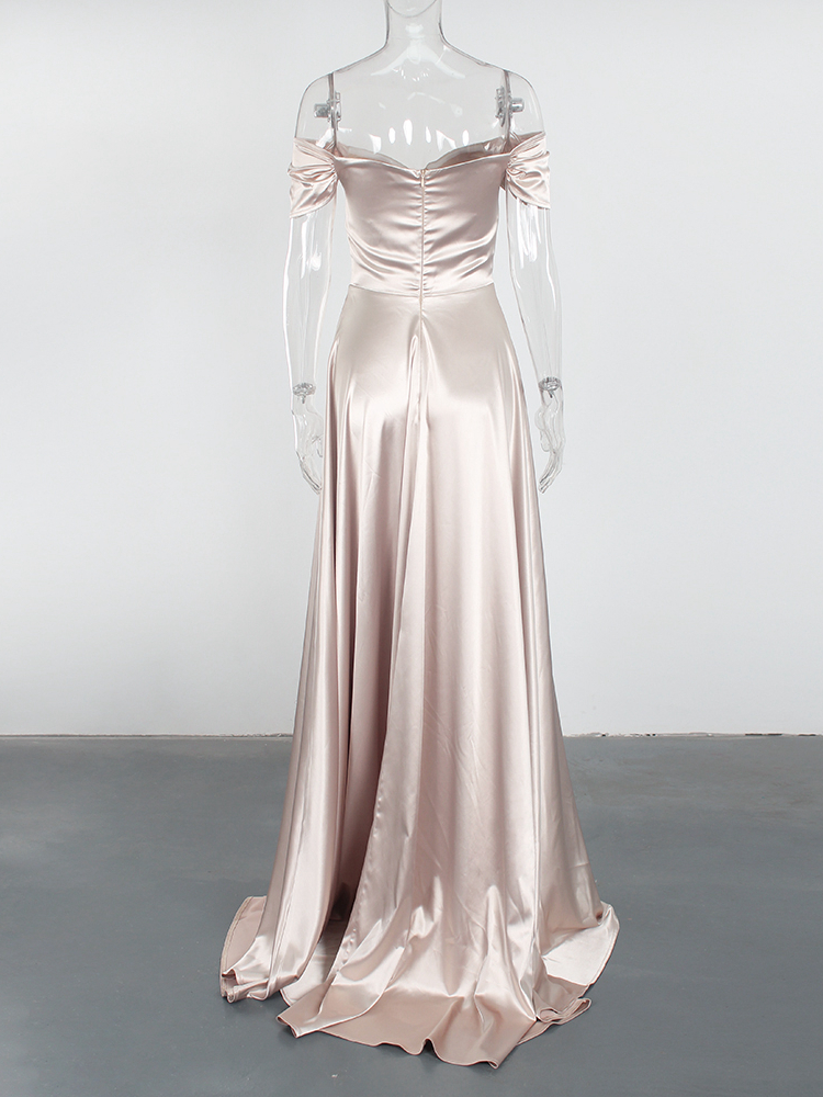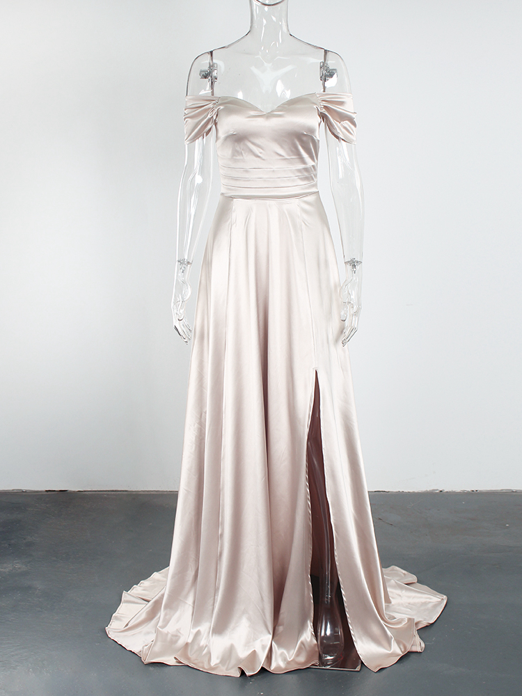 Fleepmart Off the Shoulder Solid Satin A Line Maxi Dress Stretch Slash Neck Elegant Ruch Front Slit Wedding Evening Party Long Ball Gown