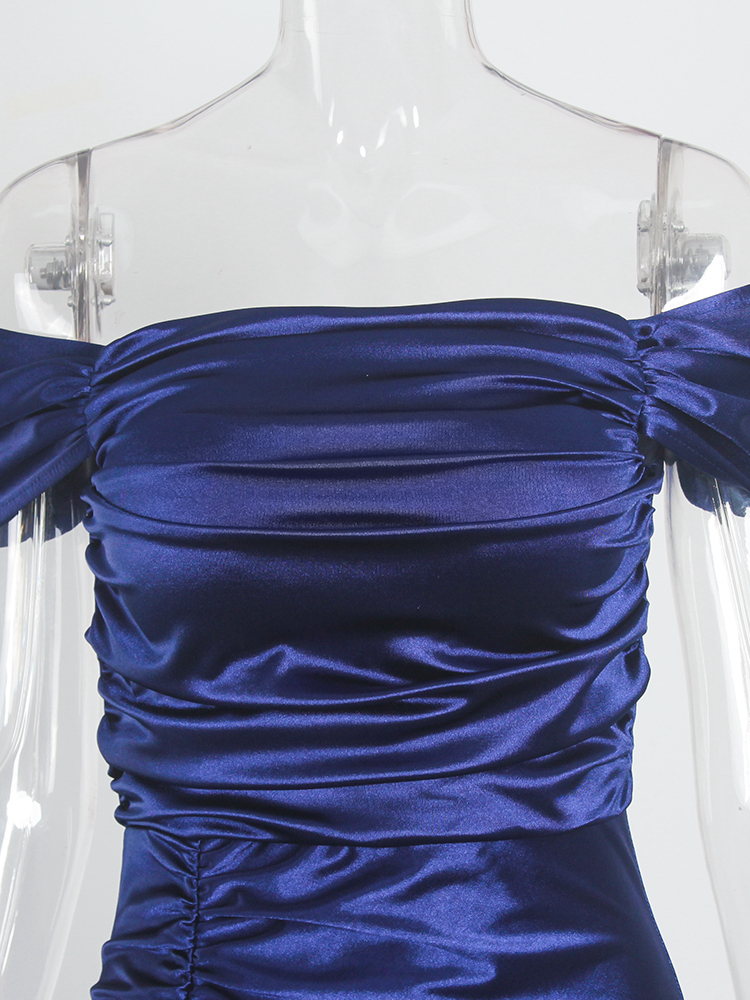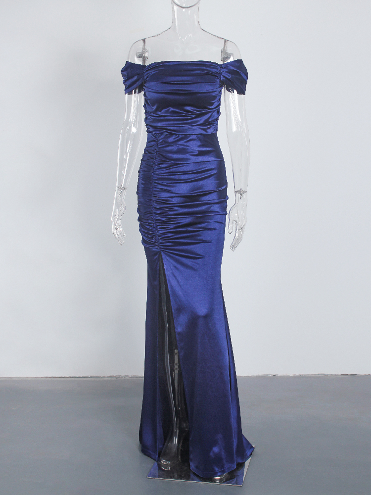 Fleepmart Off the Shoulder Solid Satin Maxi Dress Stretch Slash Neck Sexy Side Slit Pleated Evening Party Long Gown