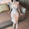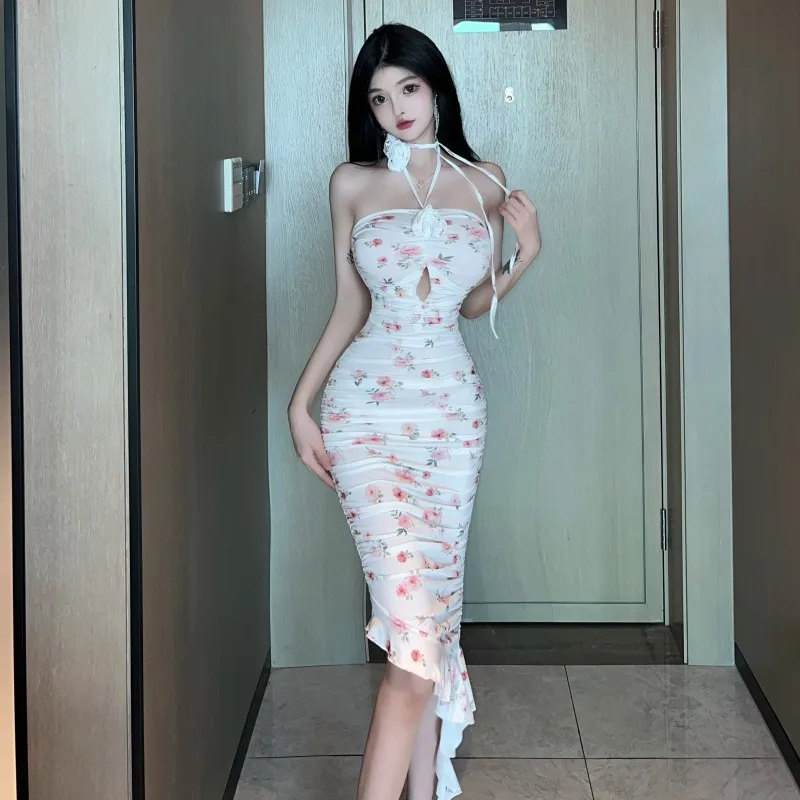Fleepmart Office Lady Dress Sexy Bra Hanging Neck Flower Pleated Ruffle Tight Dress Elegant Sweet Women Robe Party