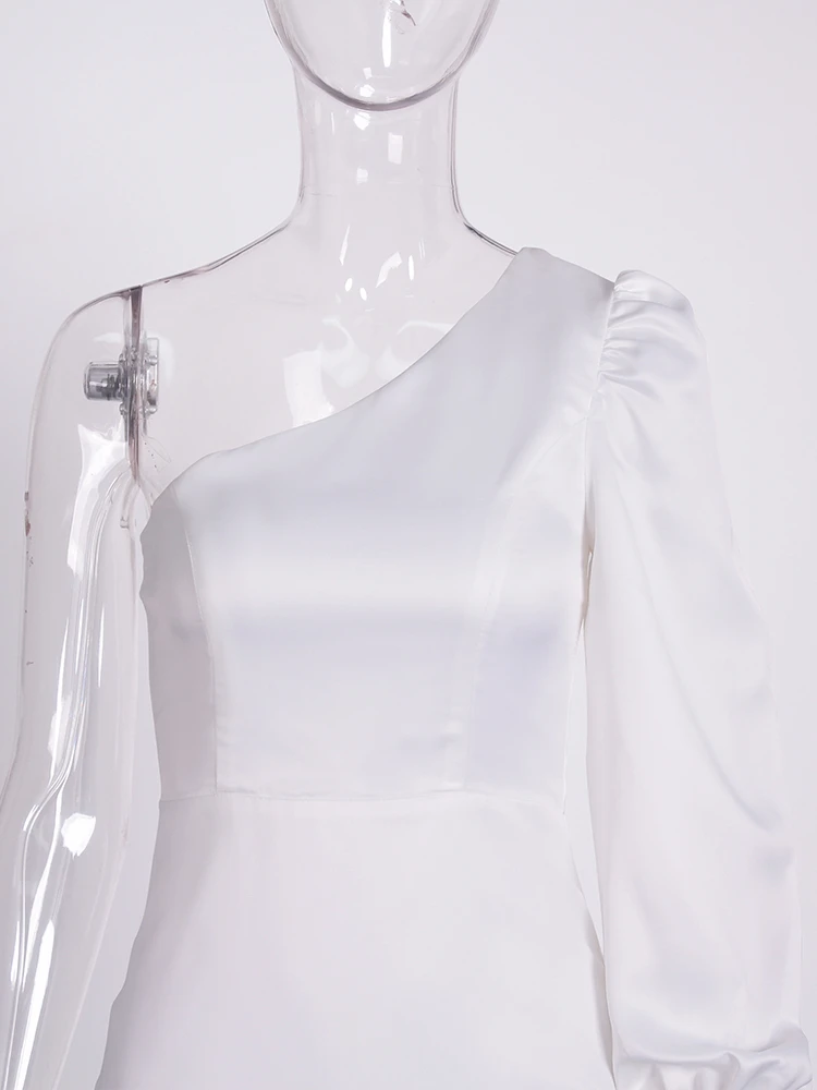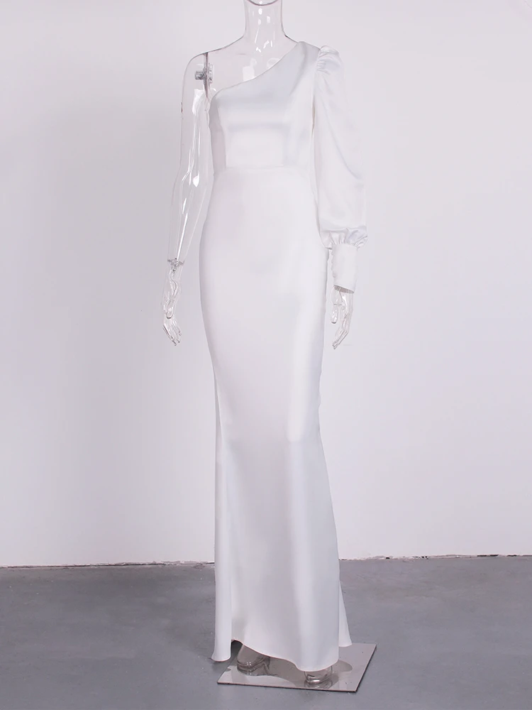 Fleepmart One Left Shoulder Long Sleeve White Bridal Dress Diagonal Collar Floor Length Bridesmaids Party DressThere are no reviews yet