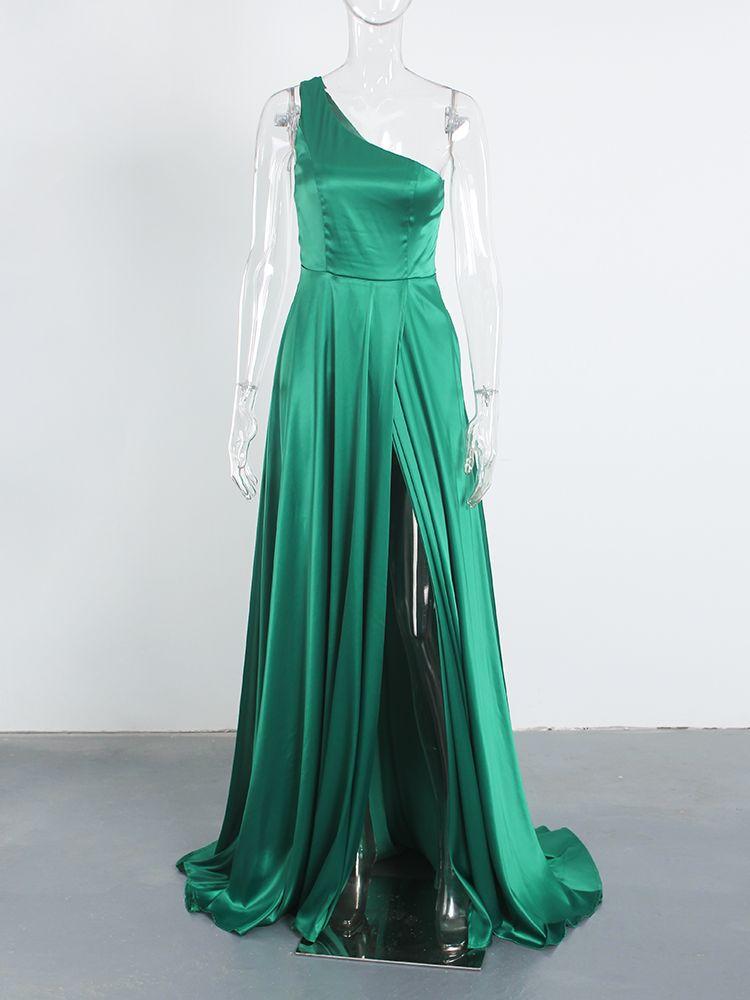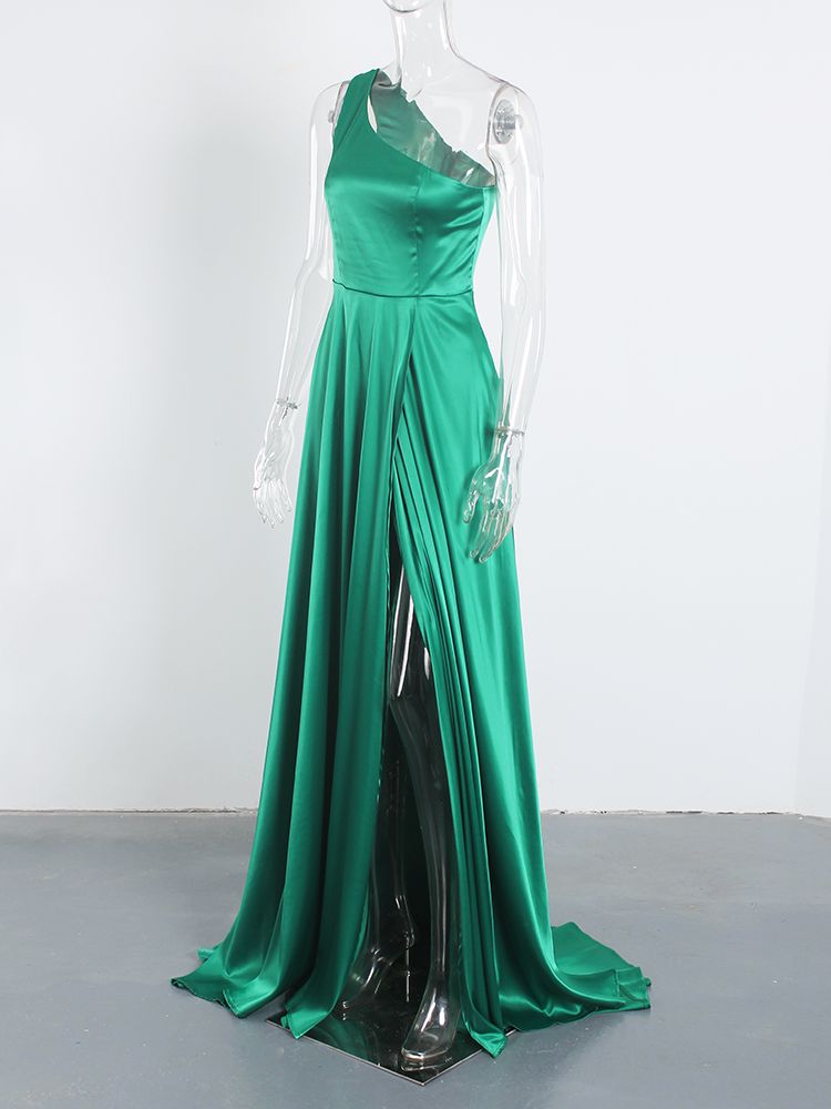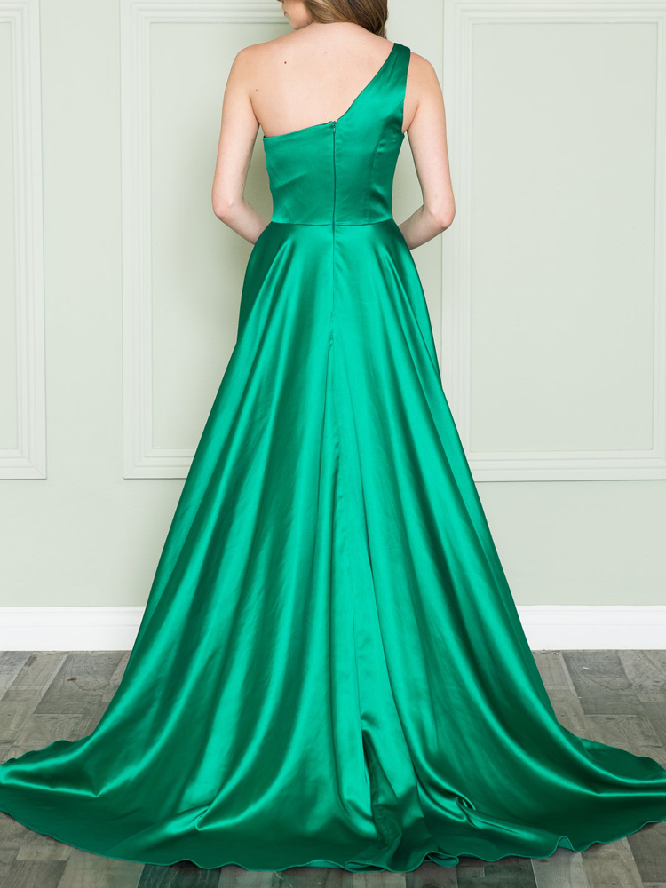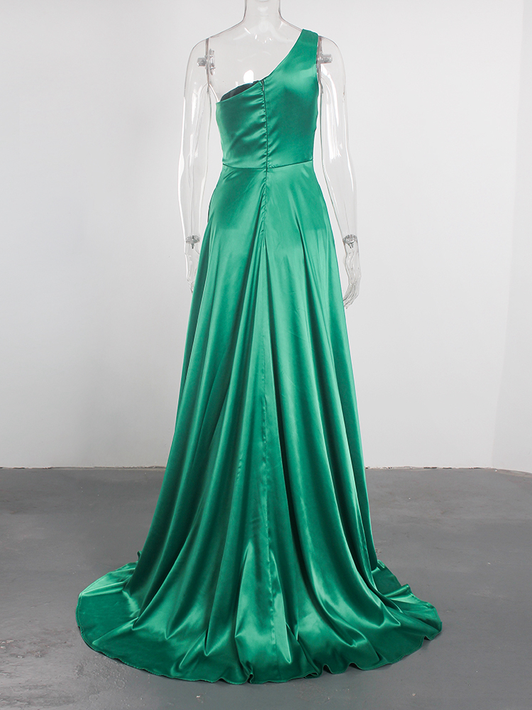 Fleepmart One Shoulder Green Prom Maxi Dress Front Slit Sleeveless Elegant A Line Ball Gown With Pockets