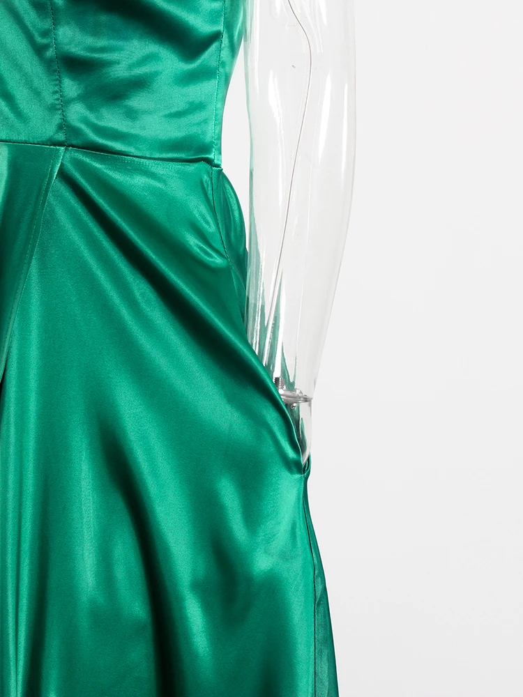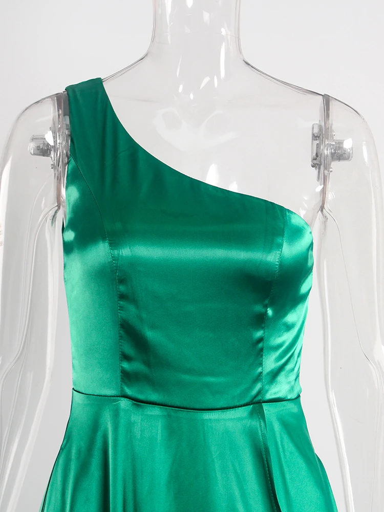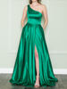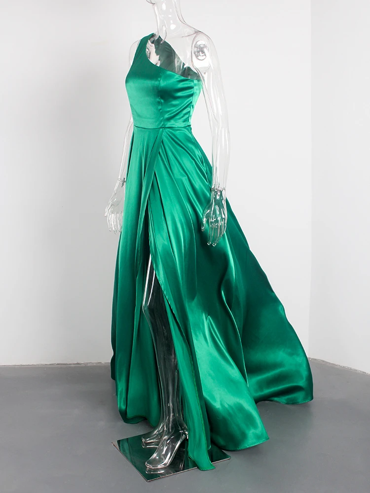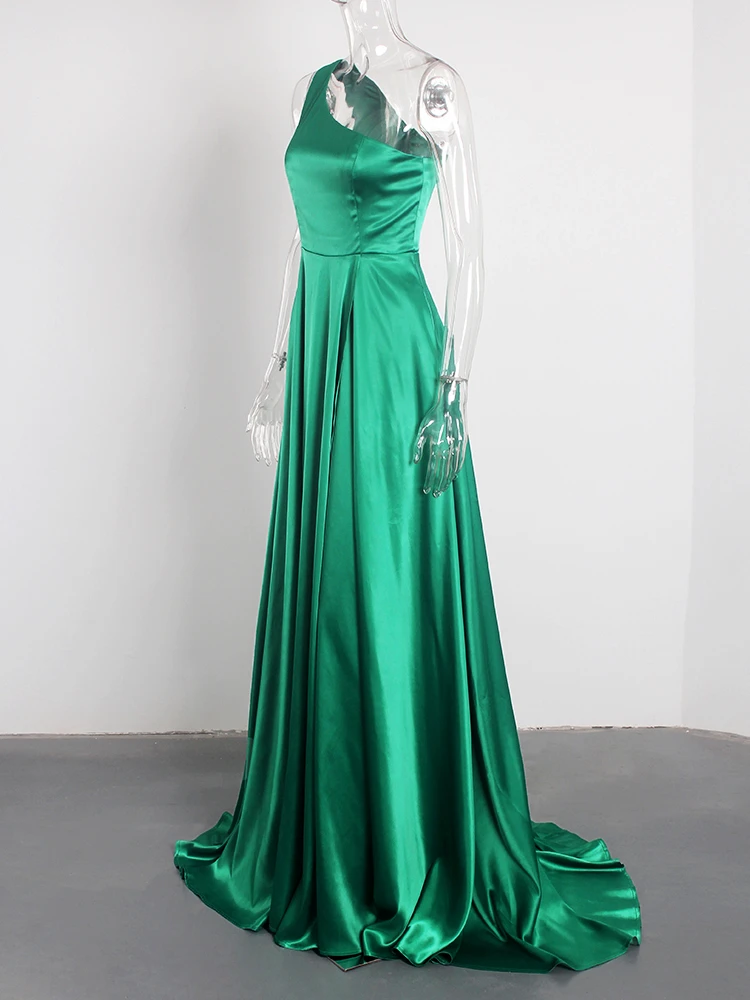 Fleepmart One Shoulder Green Prom Maxi Dress Front Slit Sleeveless Elegant A Line Ball Gown With Pockets