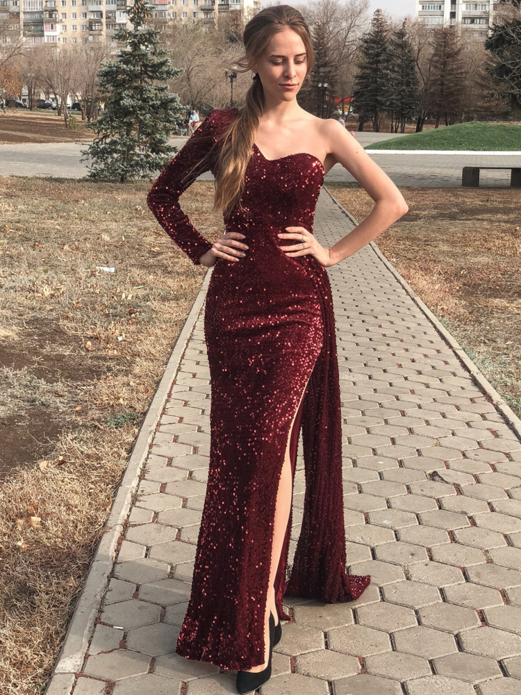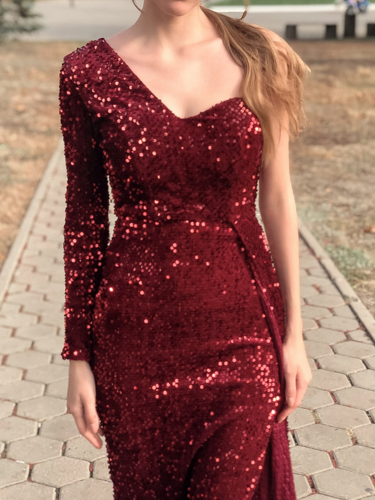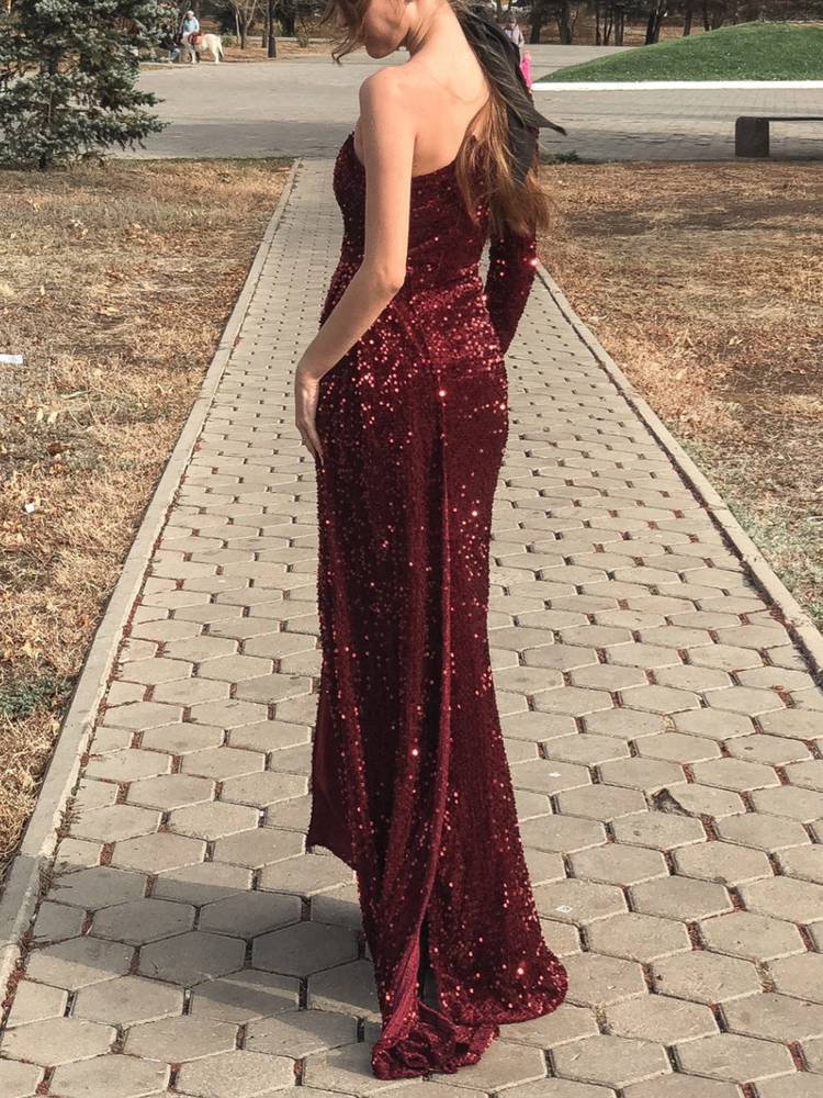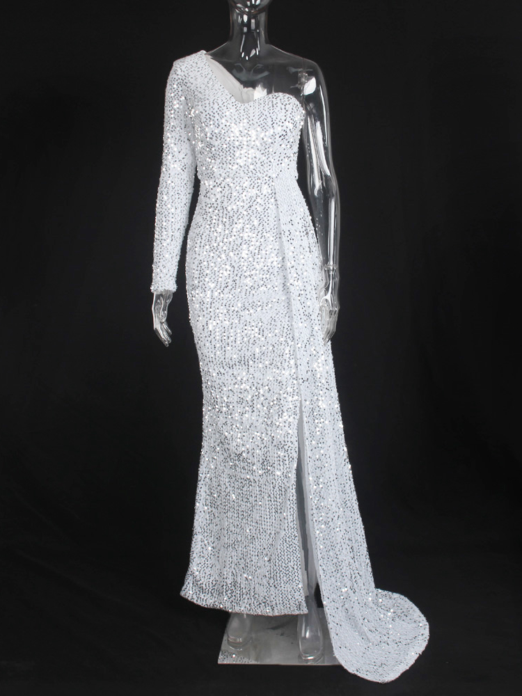 Fleepmart One Shoulder Long Train Stretch Sequin Party Dress Padded Bodycon Open Back Evening Night Gown