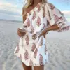 Fleepmart One Shoulder Tree Printed Loose Casual Summer Dress Women Lantern Sleeve Fashion Beach Short White Vestidos Sundress