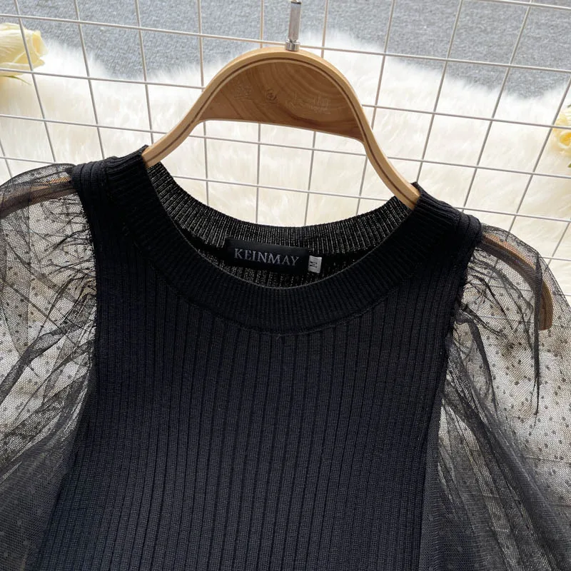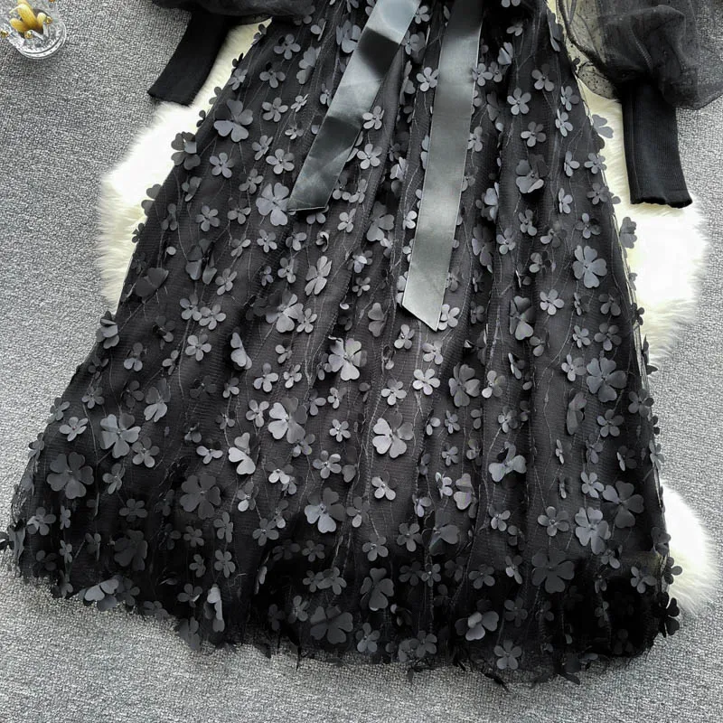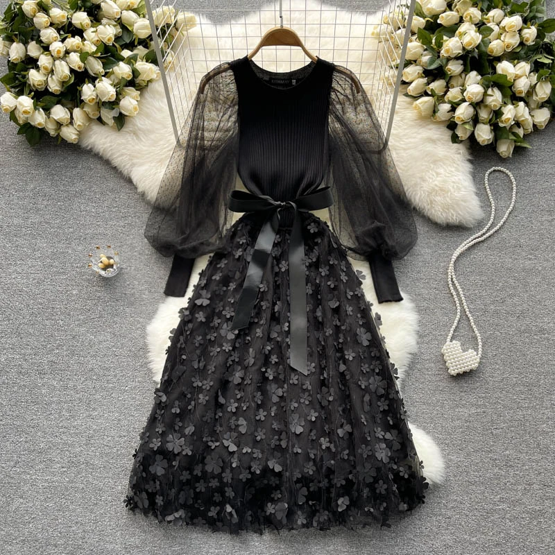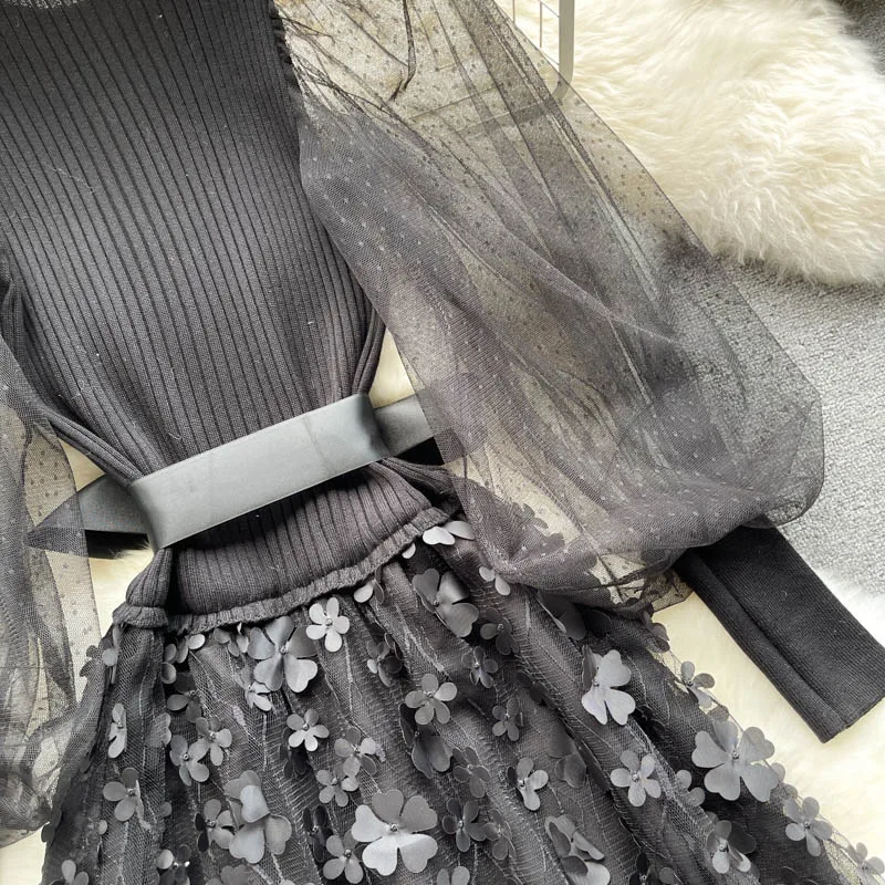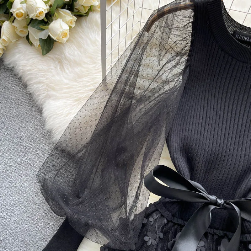 Fleepmart Palace Style Knitted Sweater Spliced Dresses Women Flower Bowknot Mesh Puff Sleeve Tulle Dress Female Autumn New Vestidos
