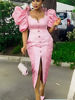 Fleepmart Party Sexy Pink Dresses Women High Slit Short Puff Sleeve Button Robes Celebrate Homecoming Event Outfits Summer Vestidos
