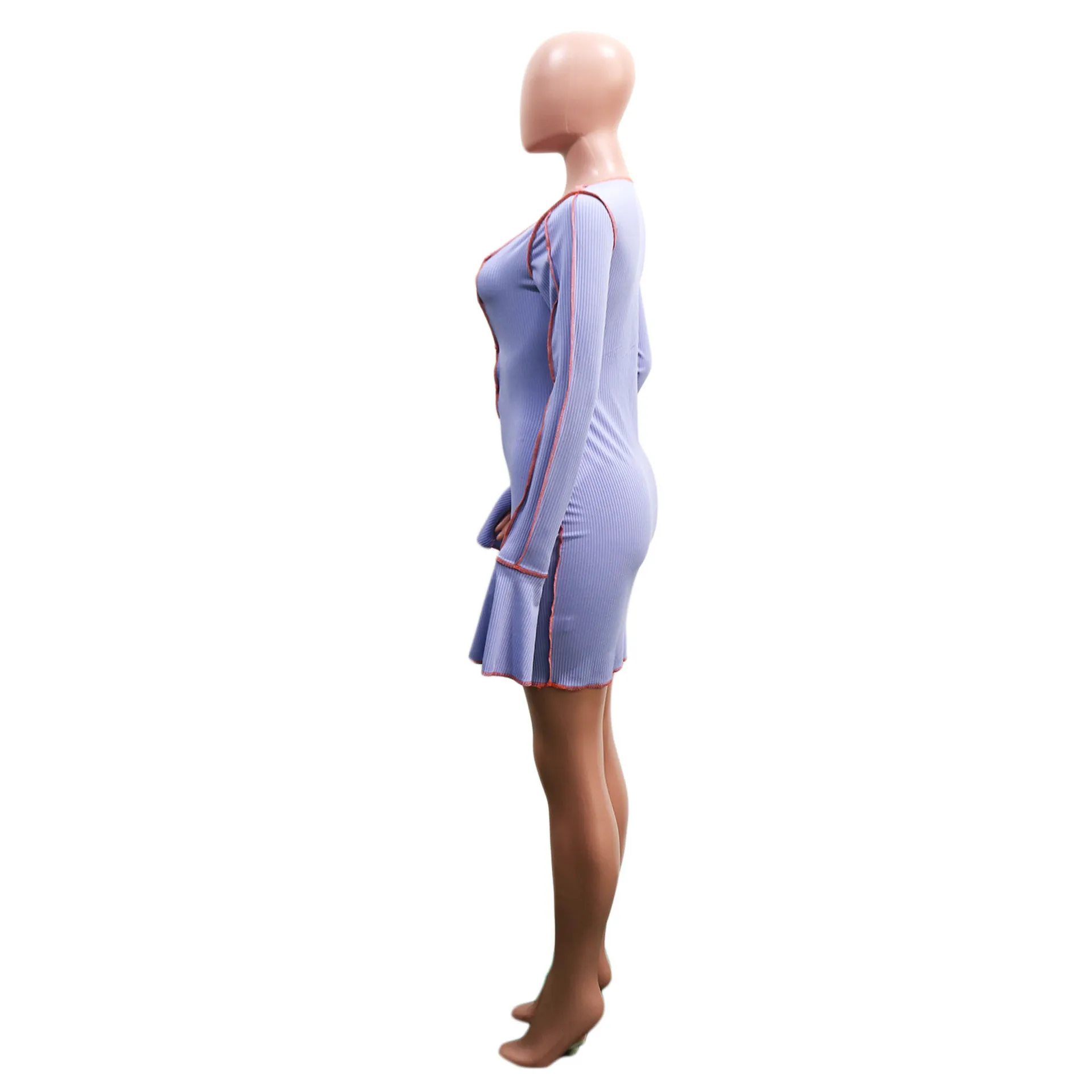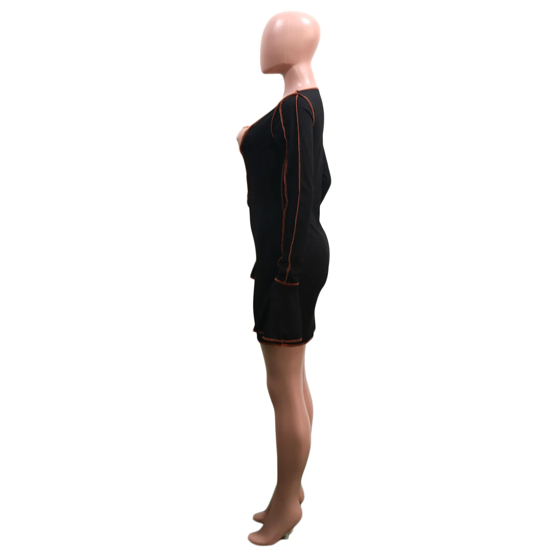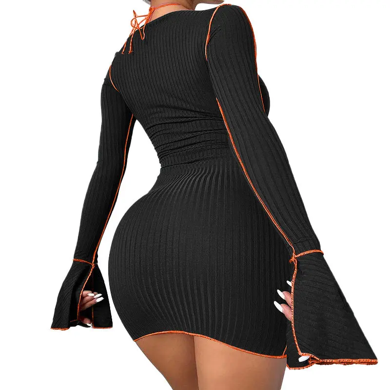 Fleepmart Patchwork Ribbed Bodycon Dresses Stripe Low-Cut Hollow Out Long Flared Sleeve Club Partywear Fashionable Lace Up Fall Clothing