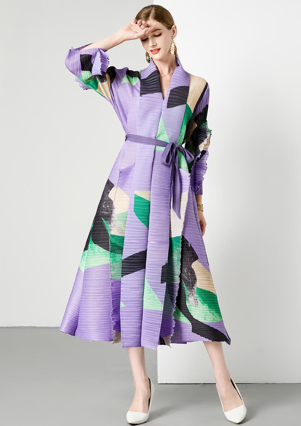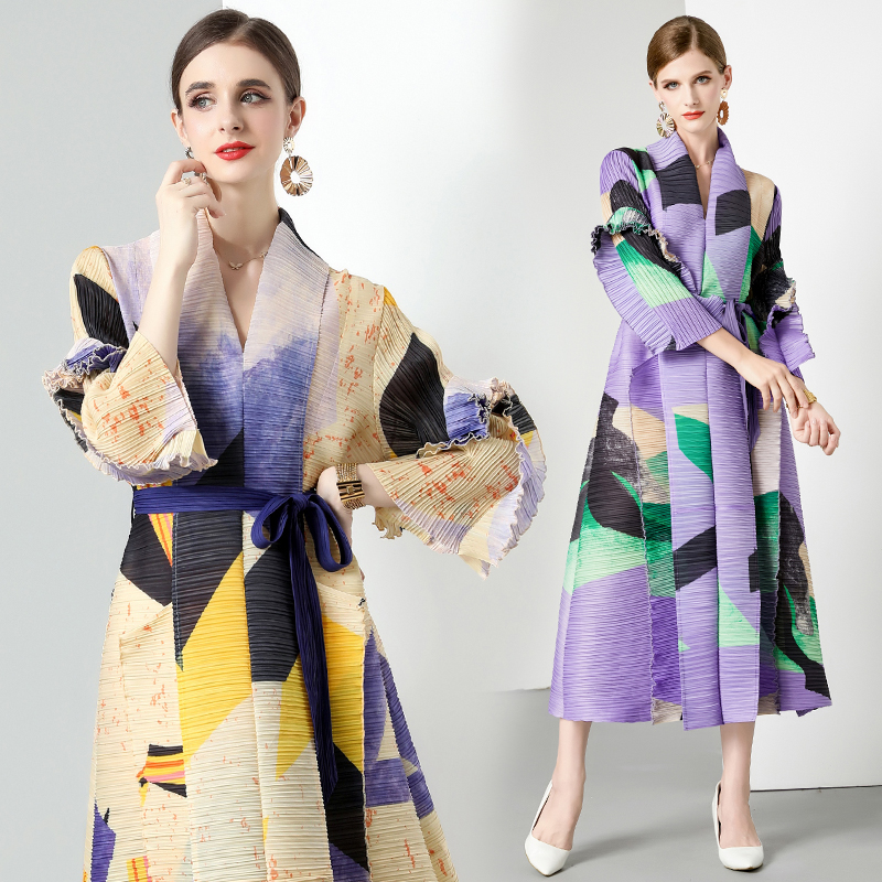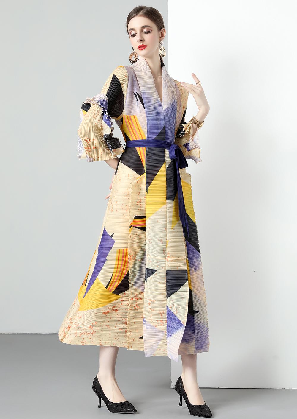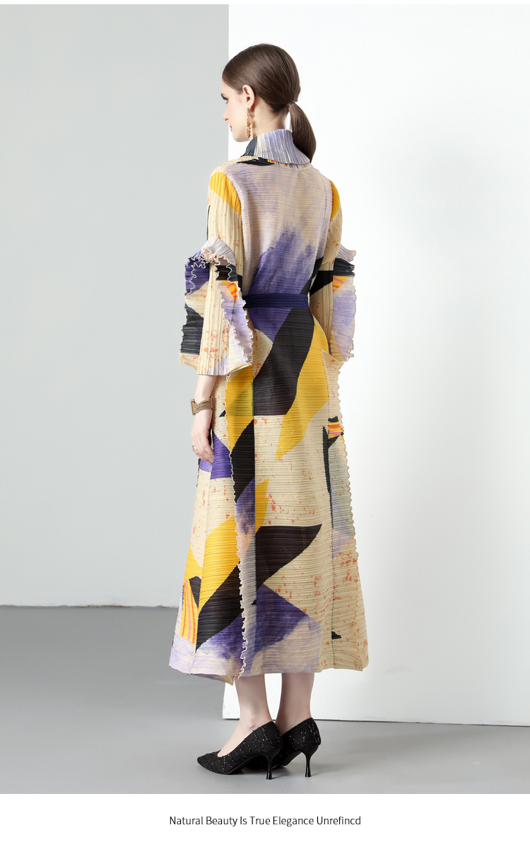 Fleepmart Pleated Long Petal Sleeve Dress Lapel Cardigan Sashes Loose High Quality Long Dress Runway Women Designer Clothes