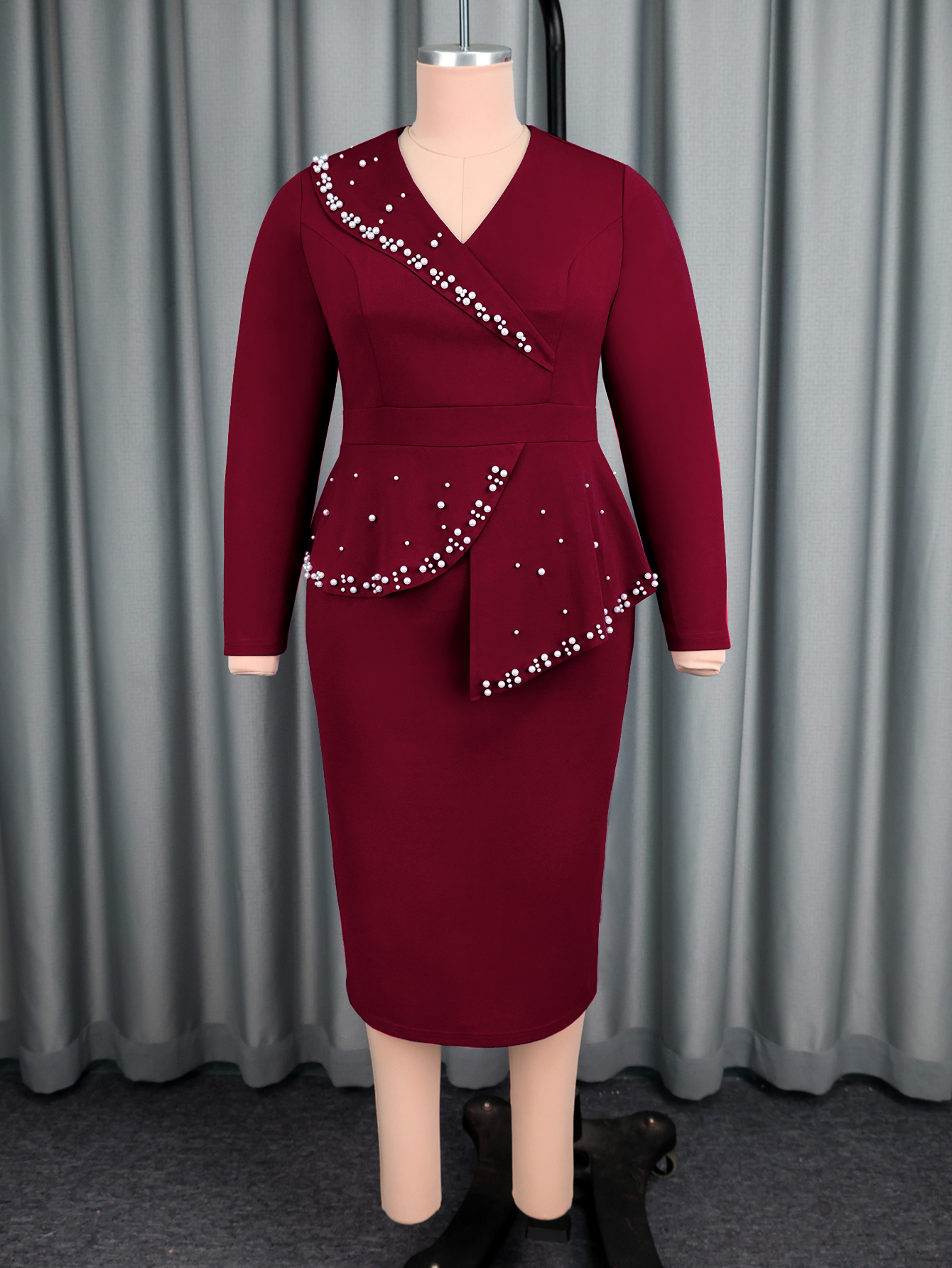 Fleepmart Plus Size Elegant Women Beaded Dress with Turn Down Collar Long Sleeve Peplum Package Hip Slim Evening Party Wedding Guest Gown
