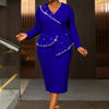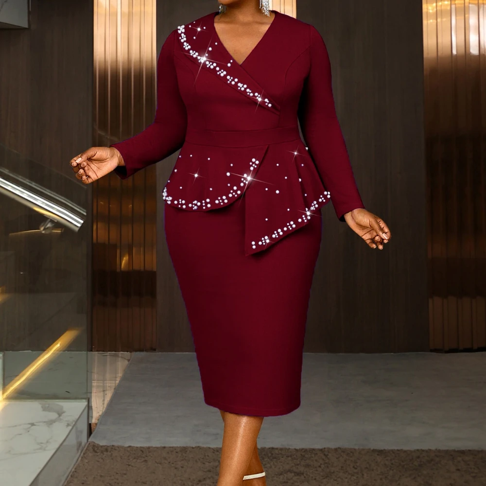 Fleepmart Plus Size Elegant Women Beaded Dress with Turn Down Collar Long Sleeve Peplum Package Hip Slim Evening Party Wedding Guest Gown
