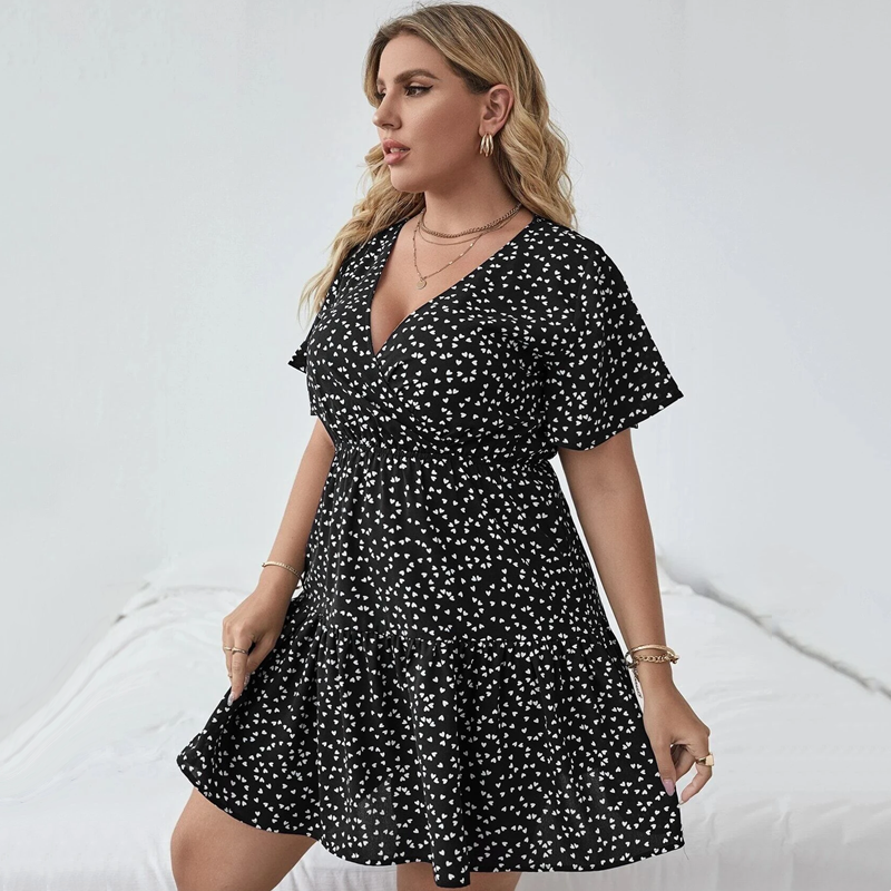 Fleepmart Plus Size Floral Print Summer Casual Tiered Dress Women Short Sleeve Heart Pattern Boho Dress Large Size Fit Flare A-line Dress