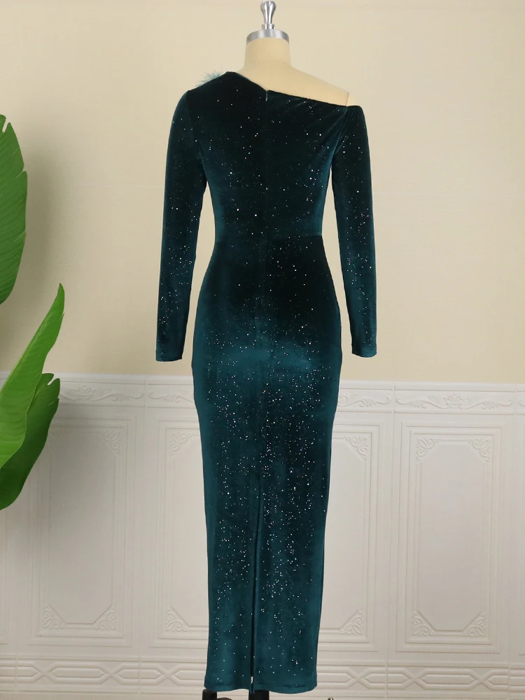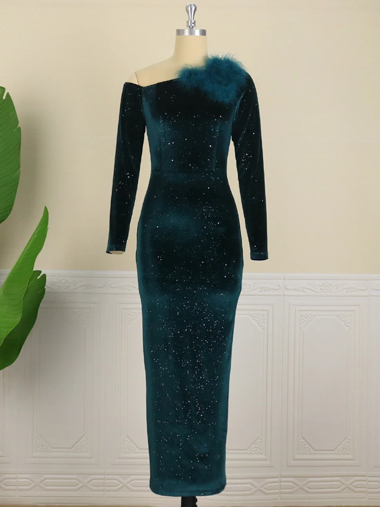 Fleepmart Plus Size Party Velvet Winter Feather Shiny Sequin Bodycon Dress Women Green Christmas Event Sheath Night Birthday Glitter Gown