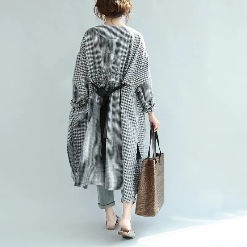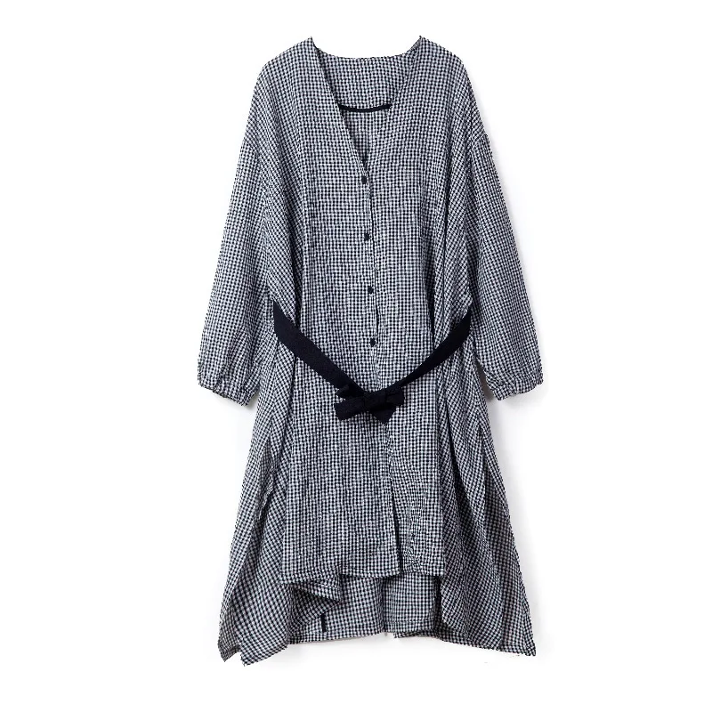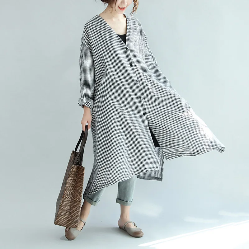 Fleepmart Plus Size Spring Korean Style Plaid Dress For Plus Size Women Loose Fit Waist-Length V-Neck Open Button Slimming Medium Lengt…