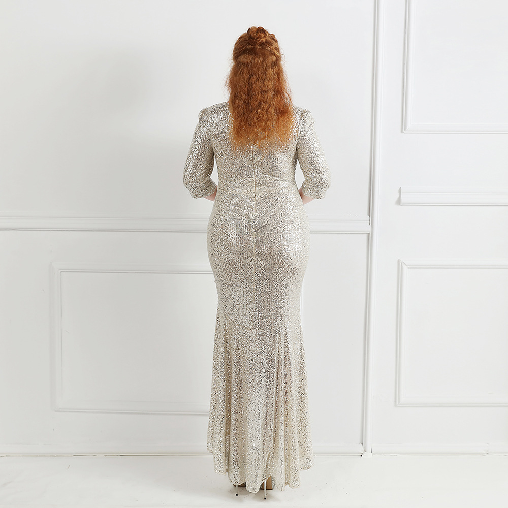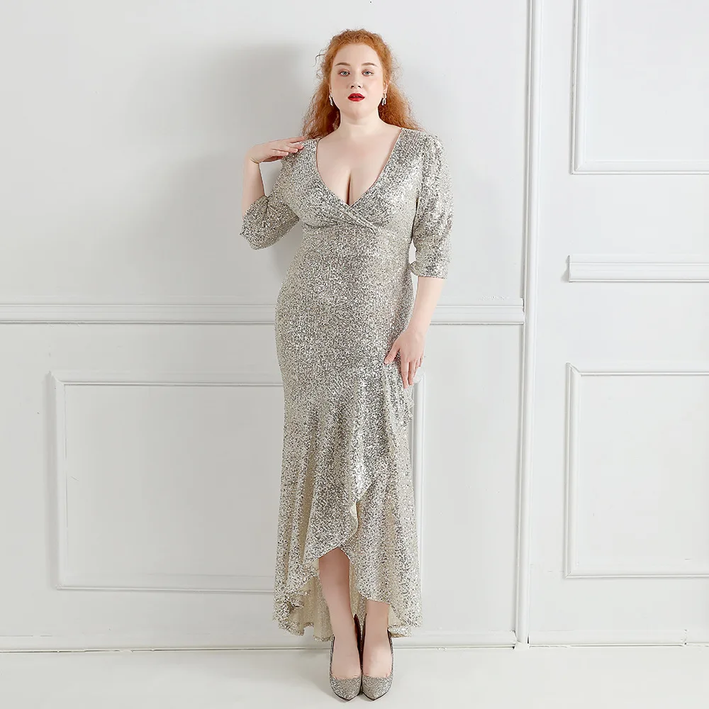 Fleepmart Plus Size Women Sexy V-Neck Party Maxi Dress Half Sleeve Prom Dress Gold Sequin Ruffles Evening Dress Vestidos De Fiesta Dress