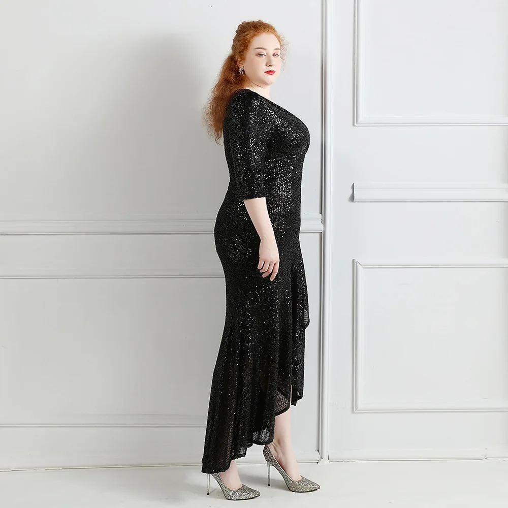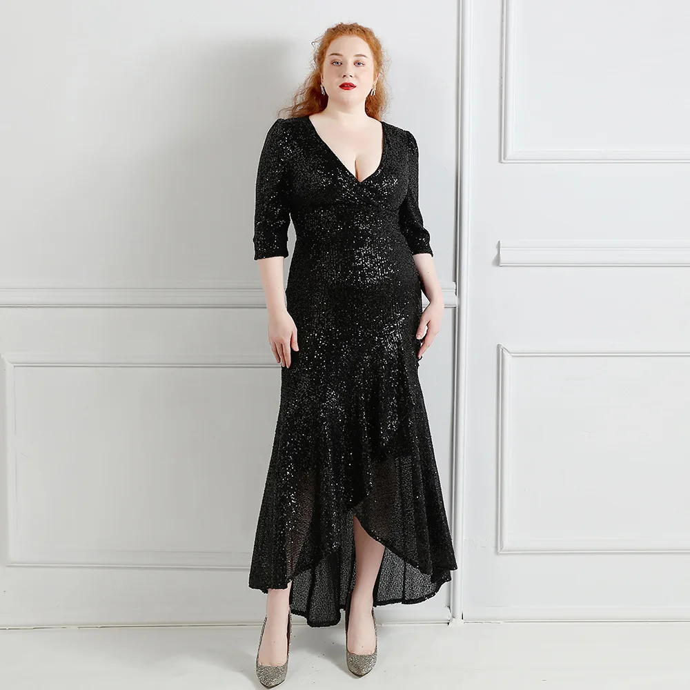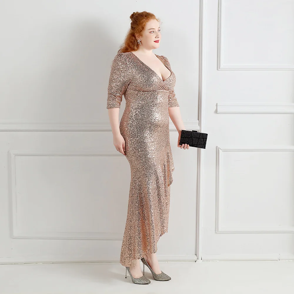 Fleepmart Plus Size Women Sexy V-Neck Party Maxi Dress Half Sleeve Prom Dress Gold Sequin Ruffles Evening Dress Vestidos De Fiesta Dress