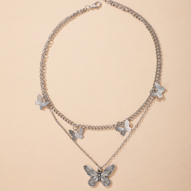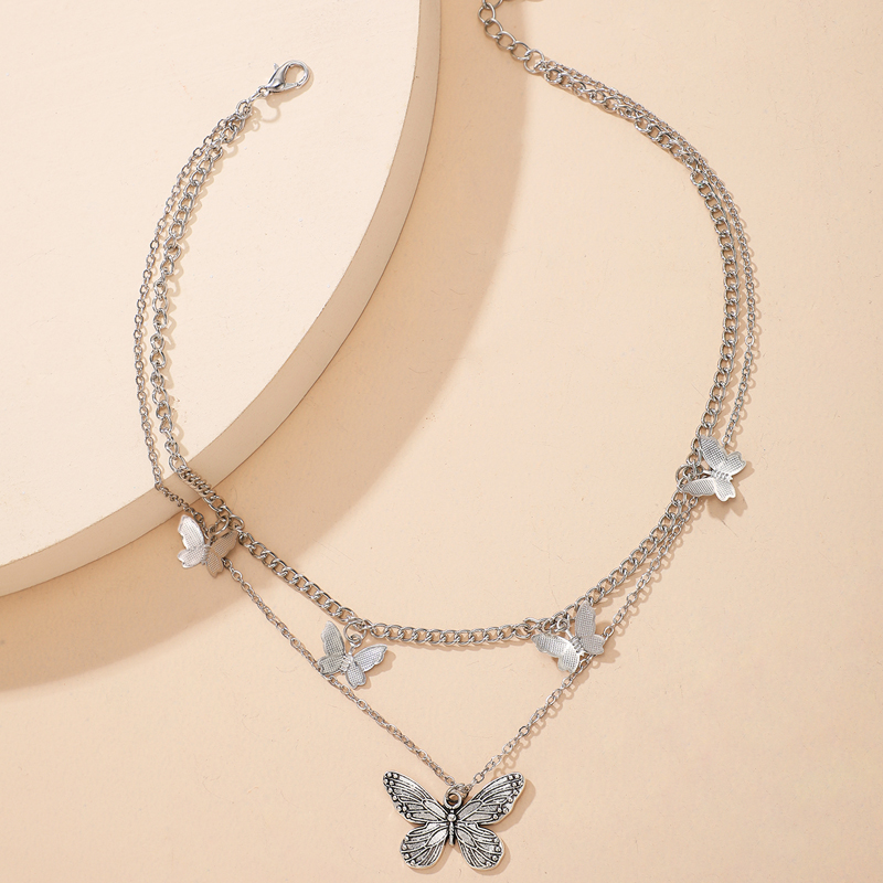 Fleepmart Pretty Butterfly Pendant Necklace for Women Vintage Silver Color Multi-layer Tassel Alloy Metal Adjustable Jewelry