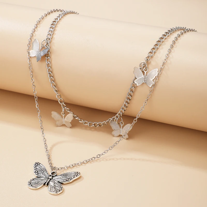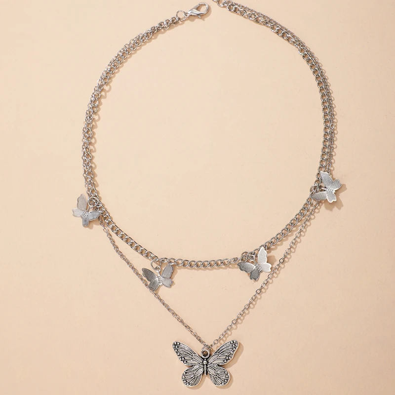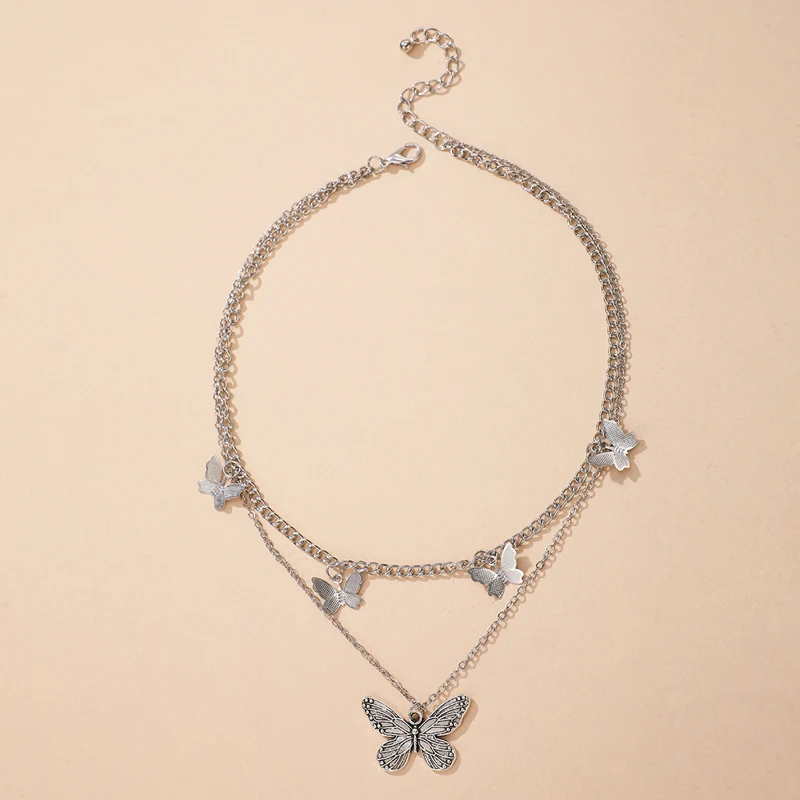 Fleepmart Pretty Butterfly Pendant Necklace for Women Vintage Silver Color Multi-layer Tassel Alloy Metal Adjustable Jewelry