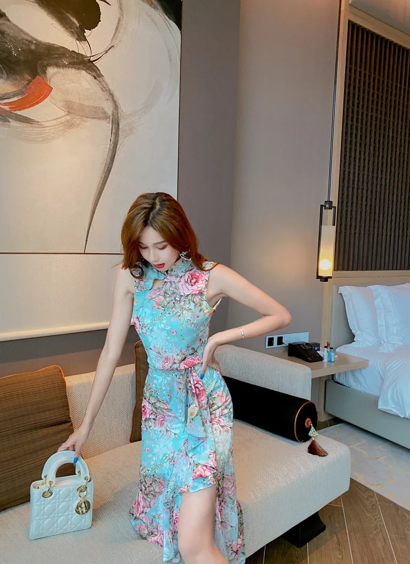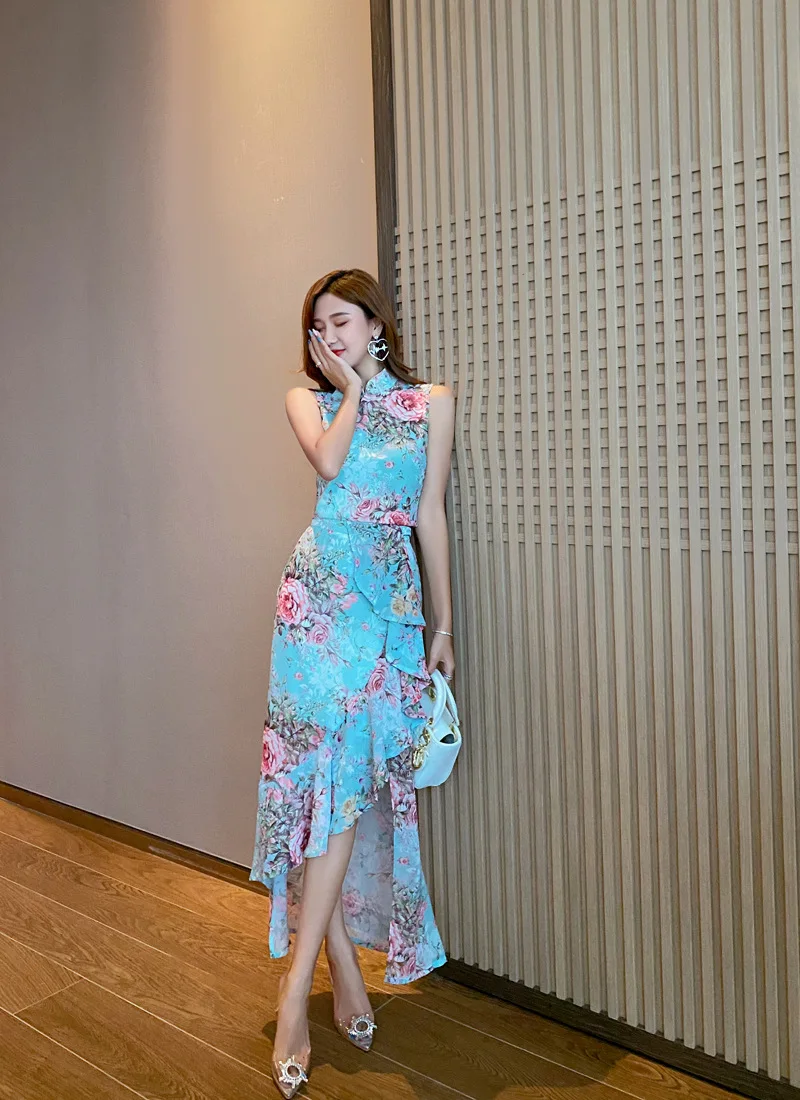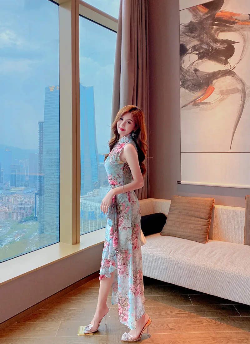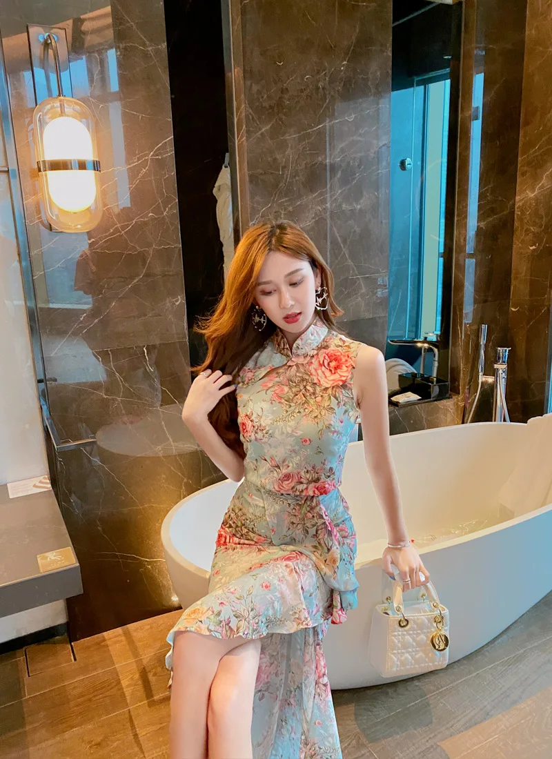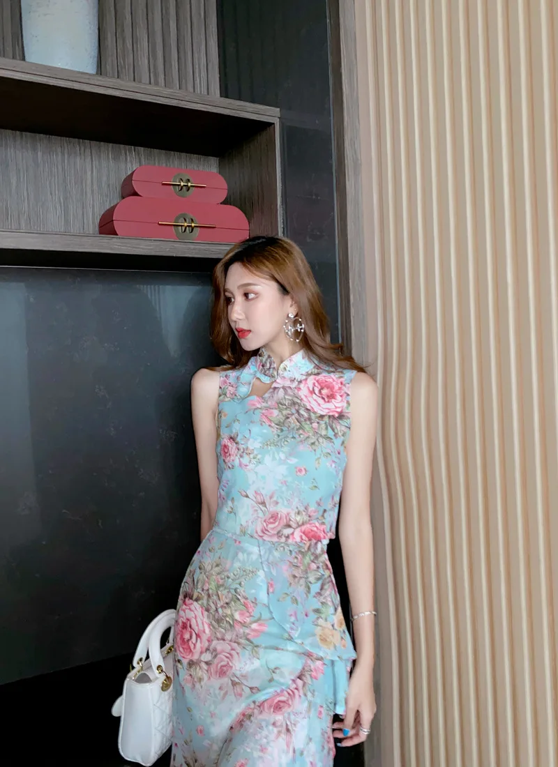 Fleepmart Printed sleeveless sexy fishtail suit skirt light mature wind woman 2020 summer new temperament two-piece suit
