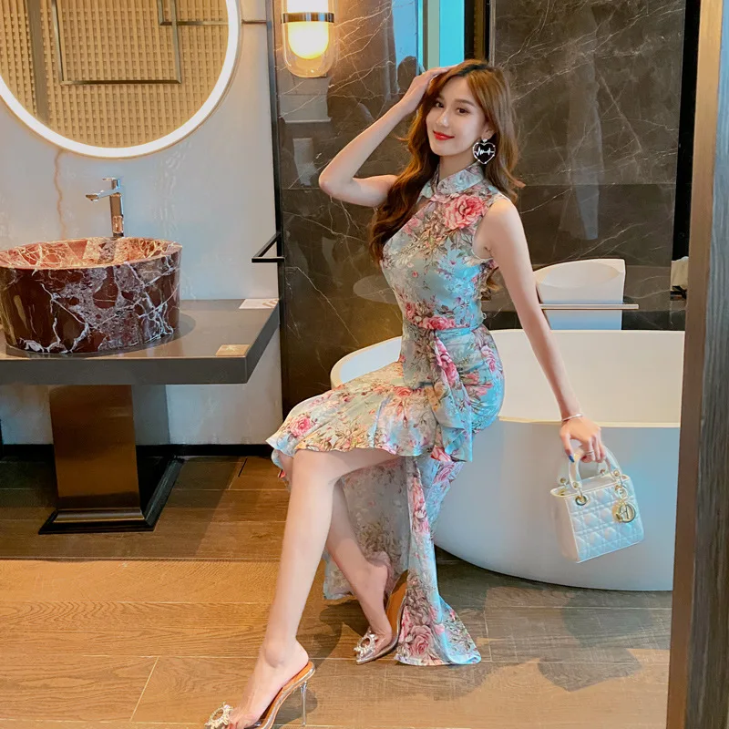 Fleepmart Printed sleeveless sexy fishtail suit skirt light mature wind woman 2021 summer new temperament two-piece suit