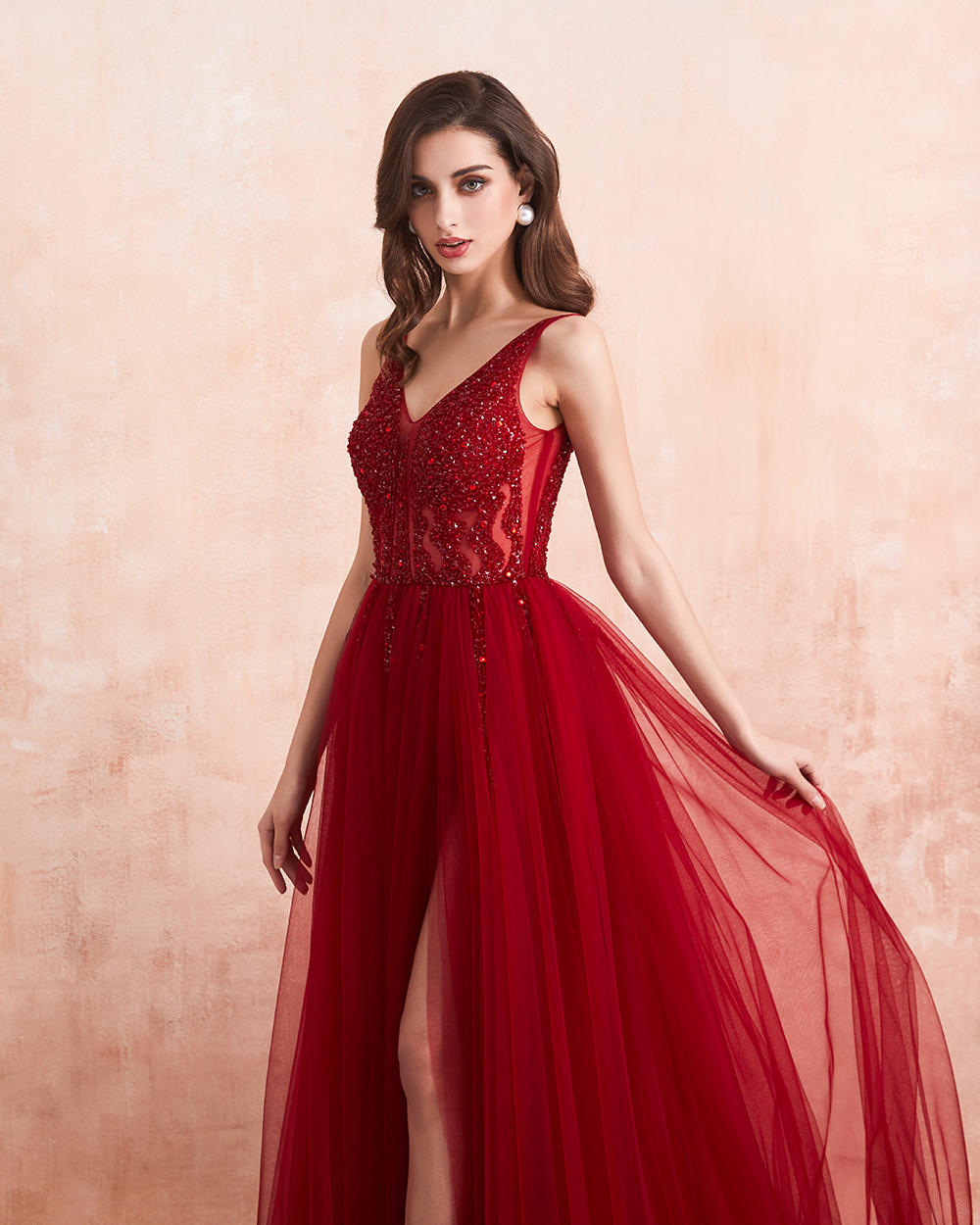 Fleepmart Prom Dresses Long Sexy V-Neck High Split Tulle Sweep Train Sleeveless Evening Gown A-Line Backless Vestido De