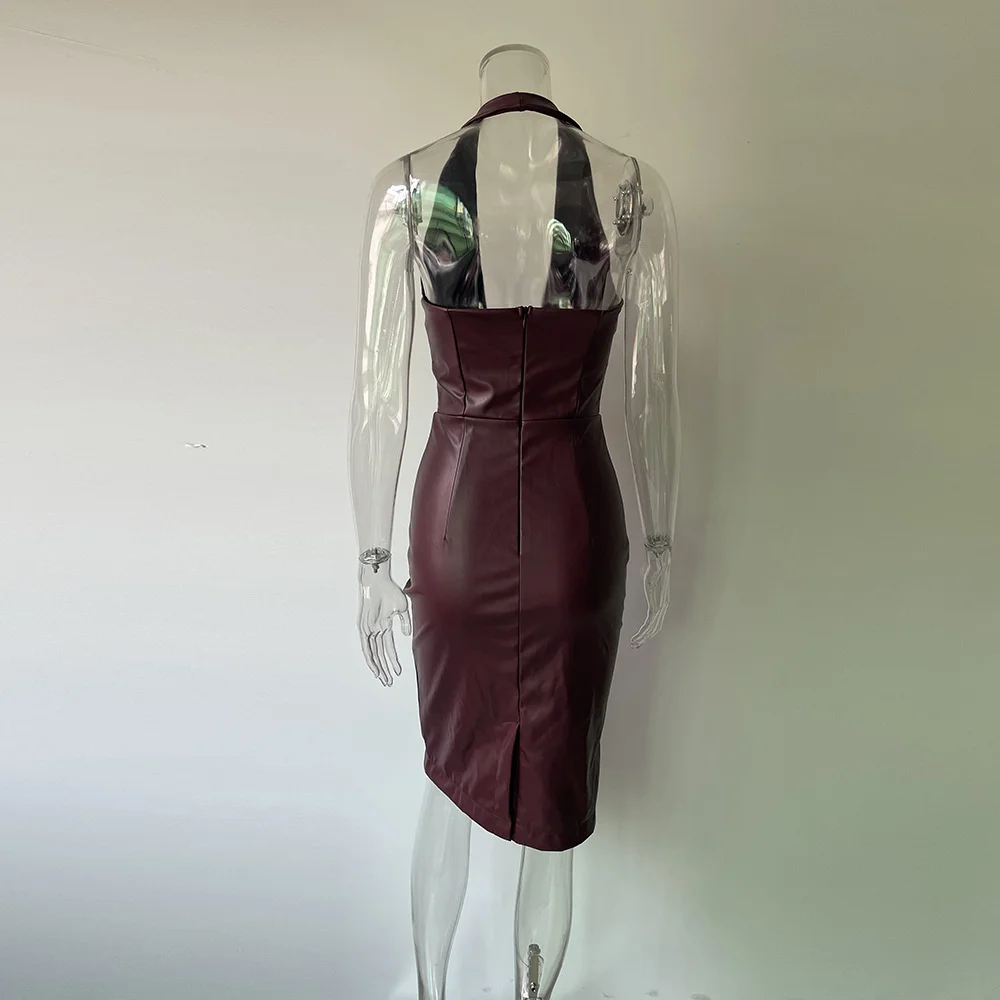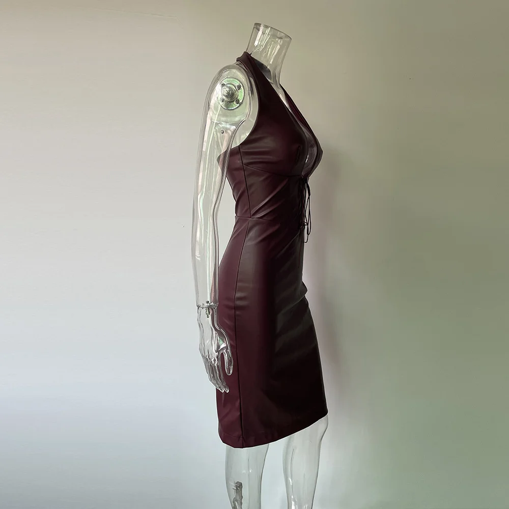 Fleepmart PU Leather Halter Party Dress For Women Clothing Vestido Fashion Lace Up Night Club Women Dresses Autumn Sexy Robes