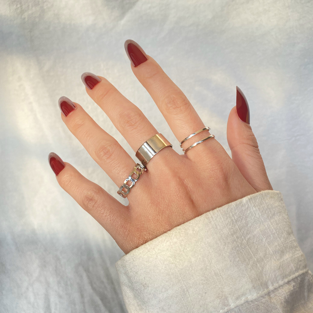 Кольца металлические, за исключением пары колец, на среднем и безымянном, похоже на пластик. Некоторые кольца можно регулировать