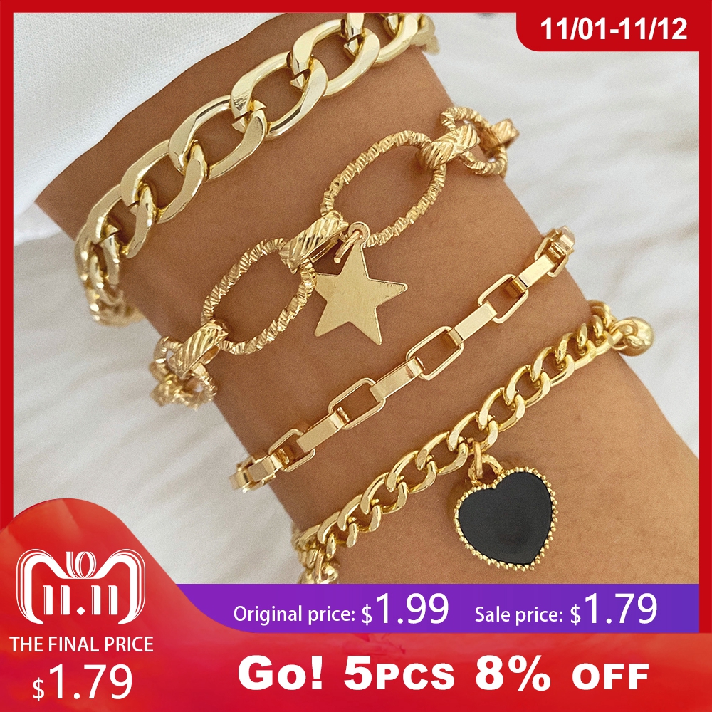 Fleepmart Punk Golden Metal Thick Chain Bracelets for Women Men Pentagram Heart Beads Pendant Charm Bracelet Set Fashion Jewelry