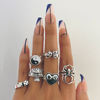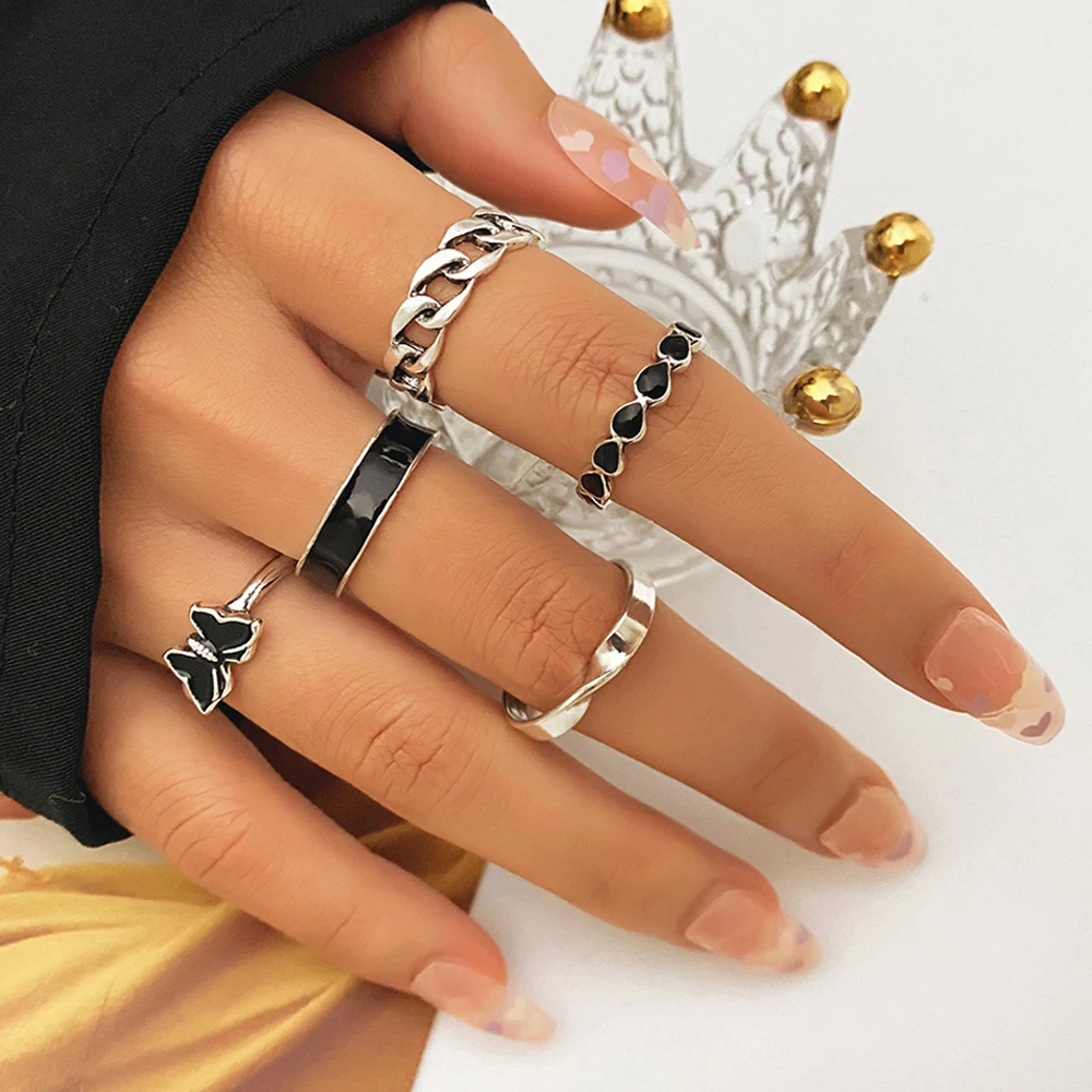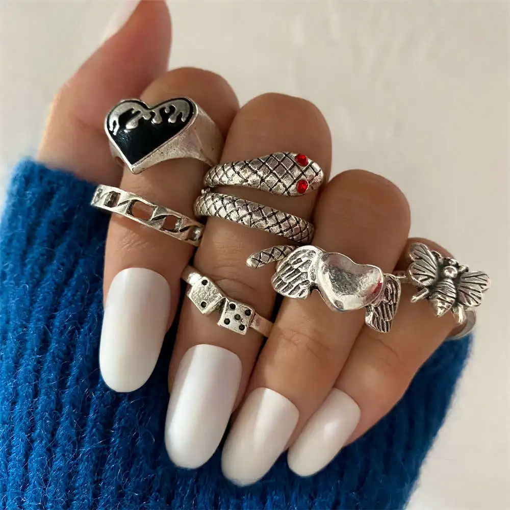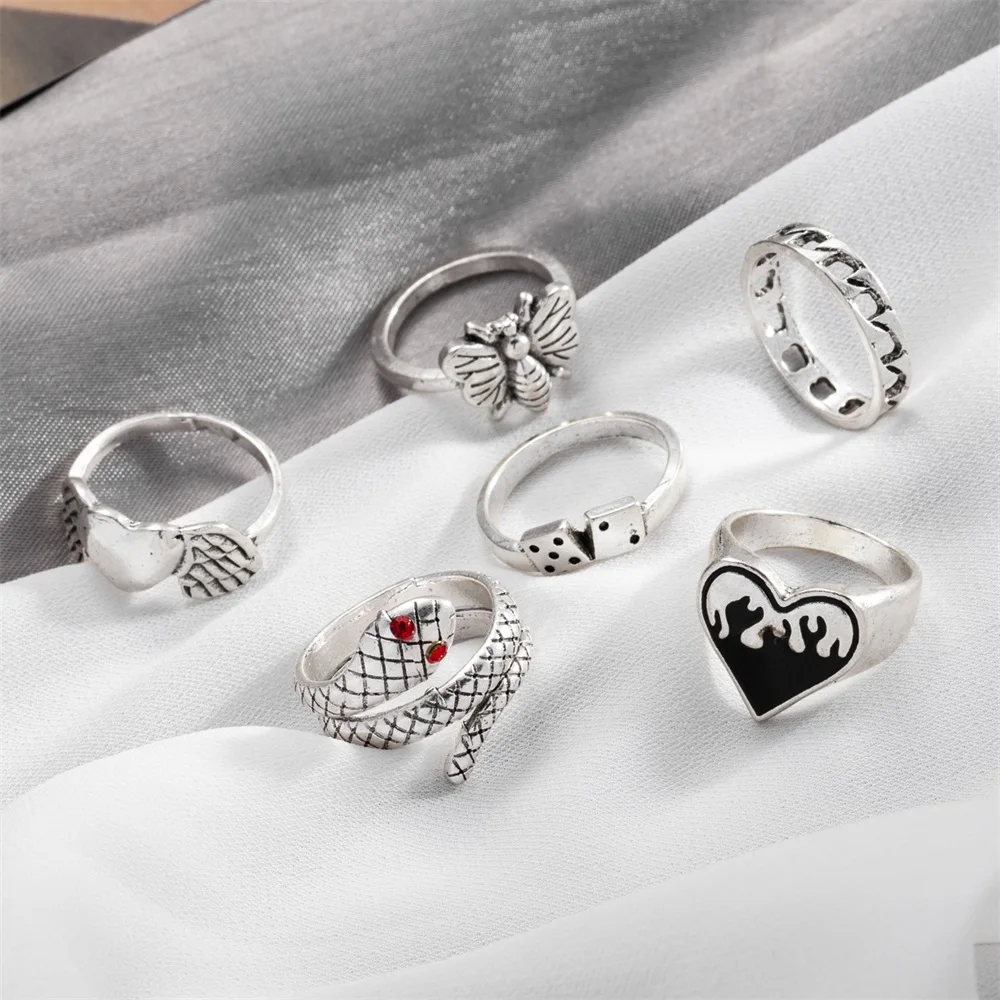 Fleepmart Punk Gothic Butterfly Snake Chain Ring Set for Women Black Dice Vintage Silver Plated Retro Charm Finger Jewelry