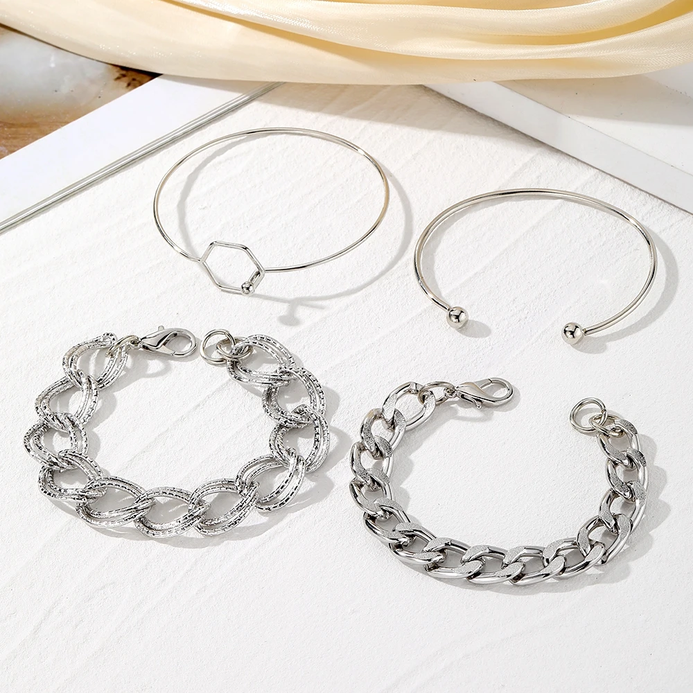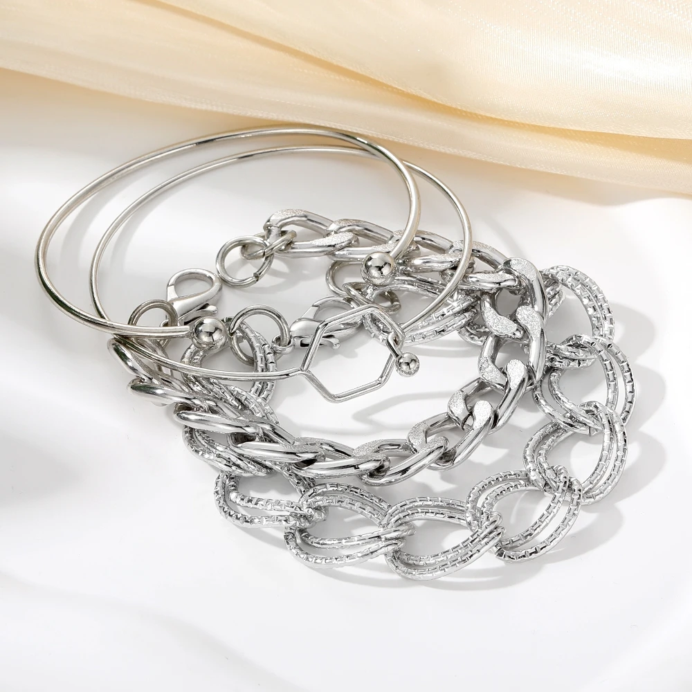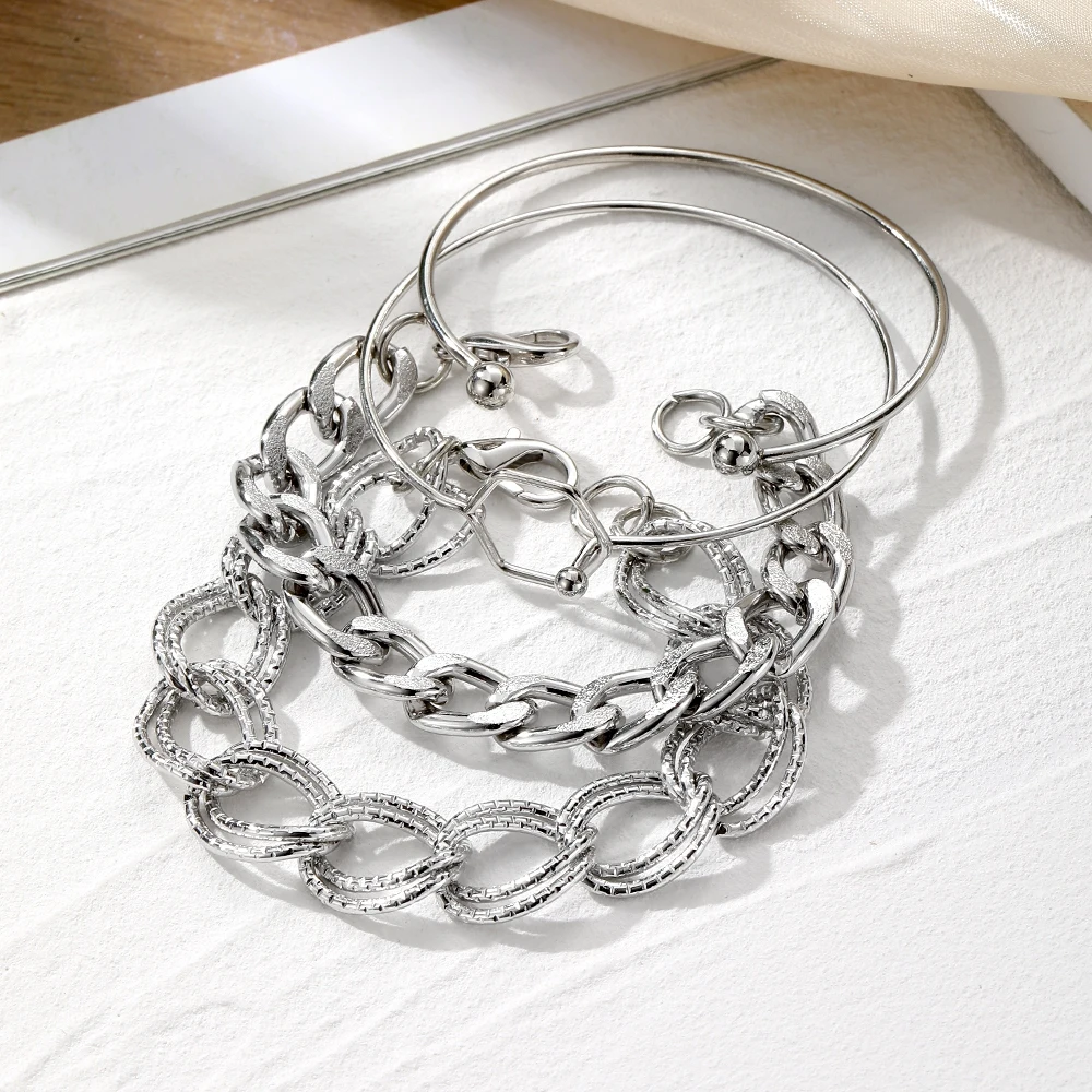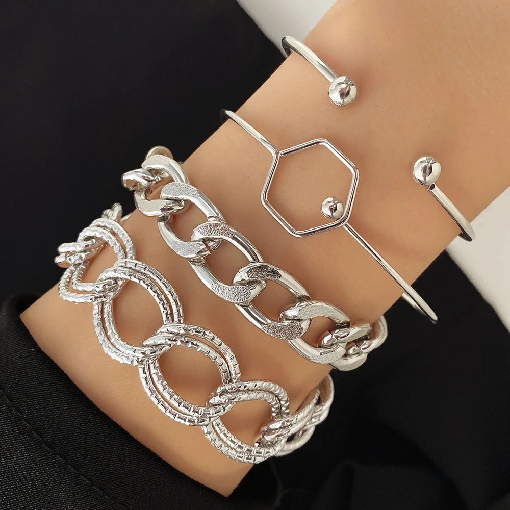 Fleepmart PUNK Silver Color Cuban Chain Bracelet for Women Men Double Layer Chains Bracelets Set Hippop Fashion Jewelry Gifts