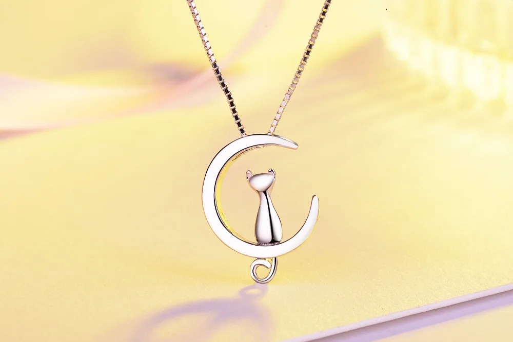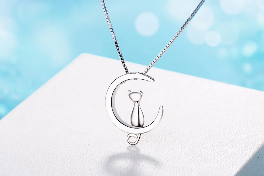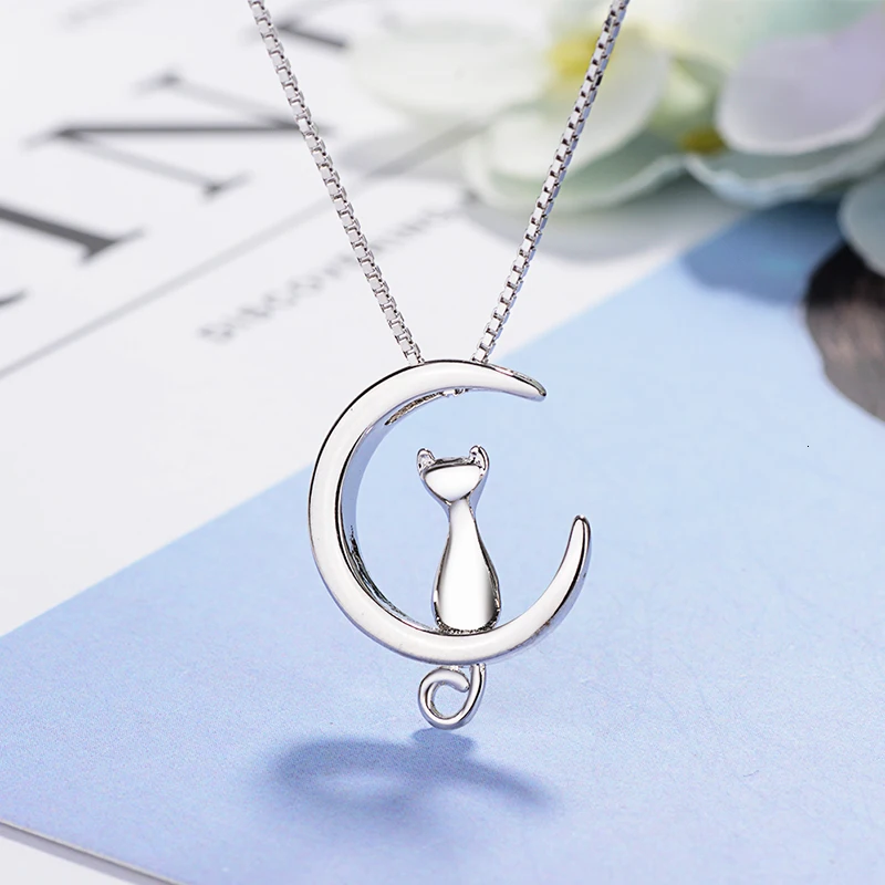 | Fleepmart Real Pure 925 Sterling Silver Cat Moon Necklaces Pendant Long Kitty Necklace For Women Hot Fashion Sterling-silver-jewelry |