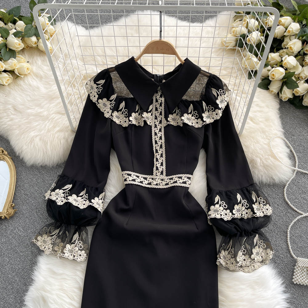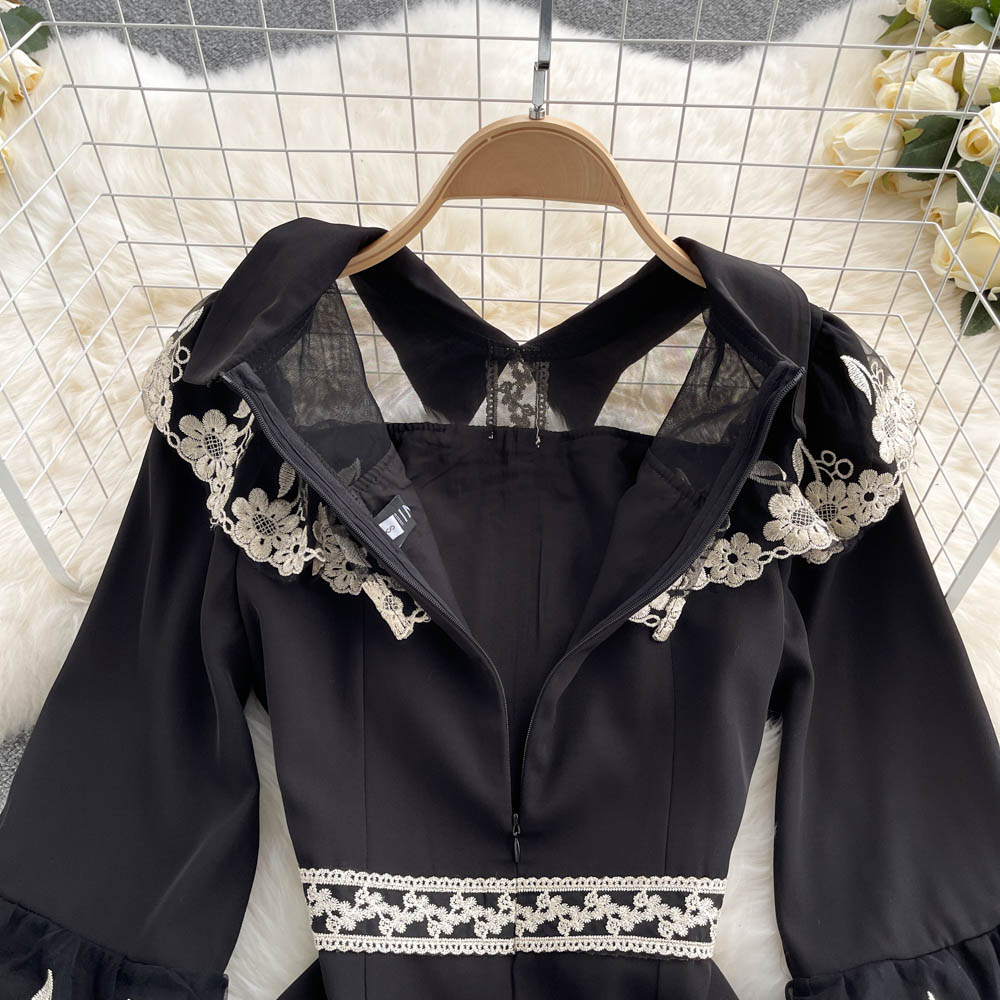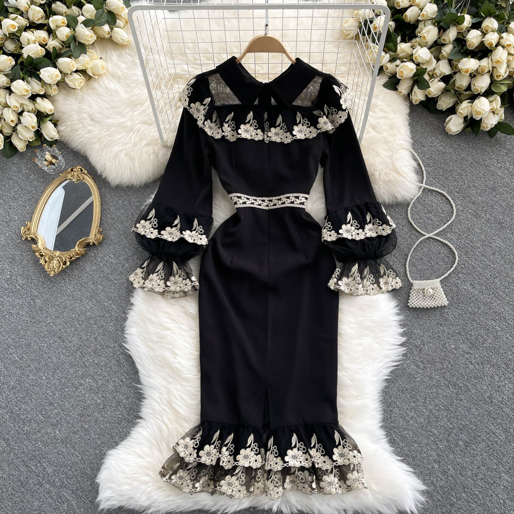 Fleepmart Retro Embroidery Flower Mermaid Dress Female Elegant Slim Ruffle Party Dresses Fashion Streetwear Autumn Midi Dress