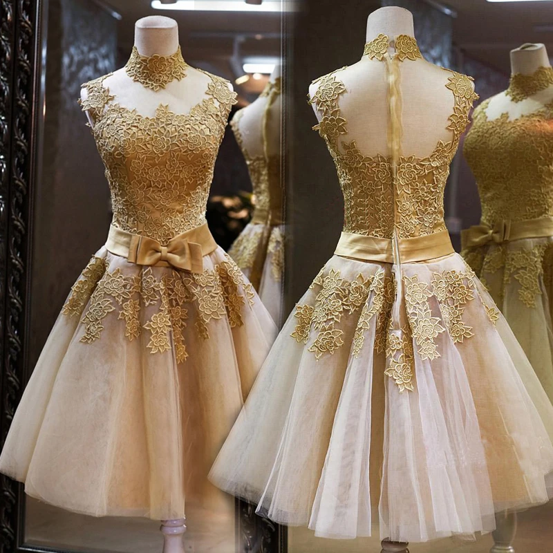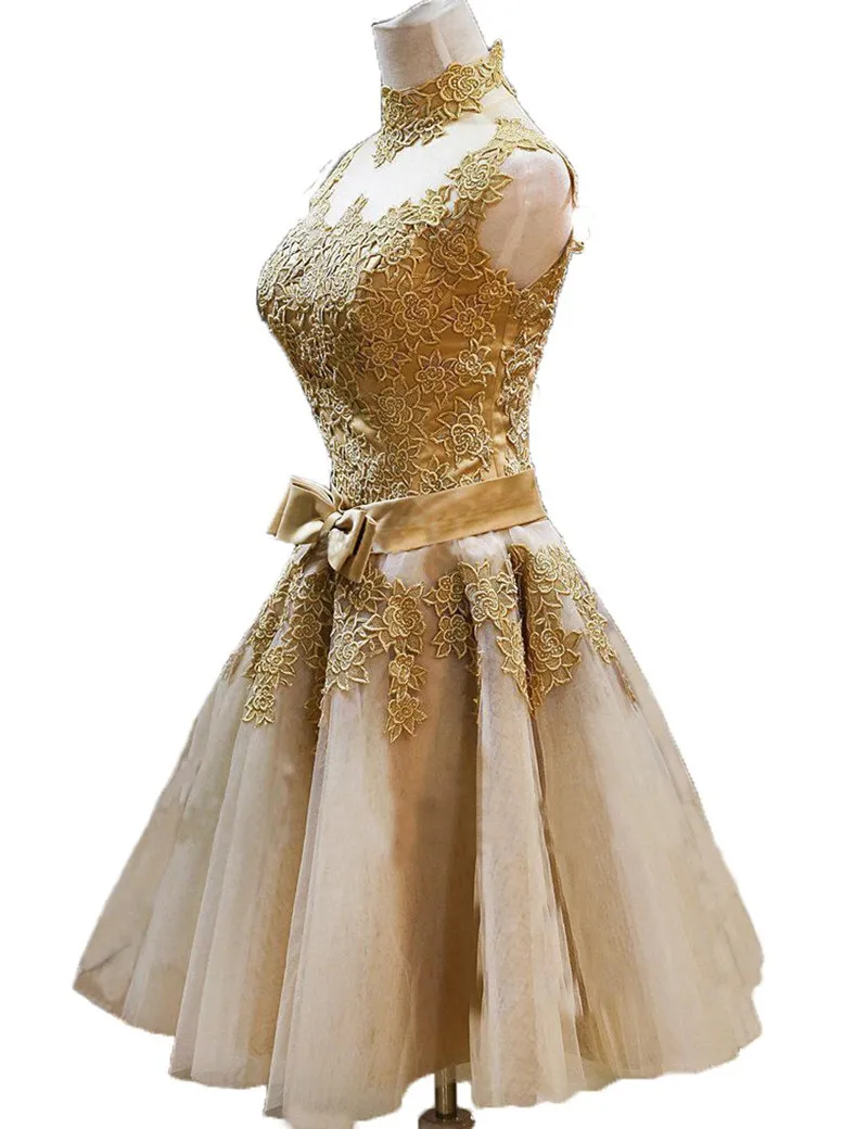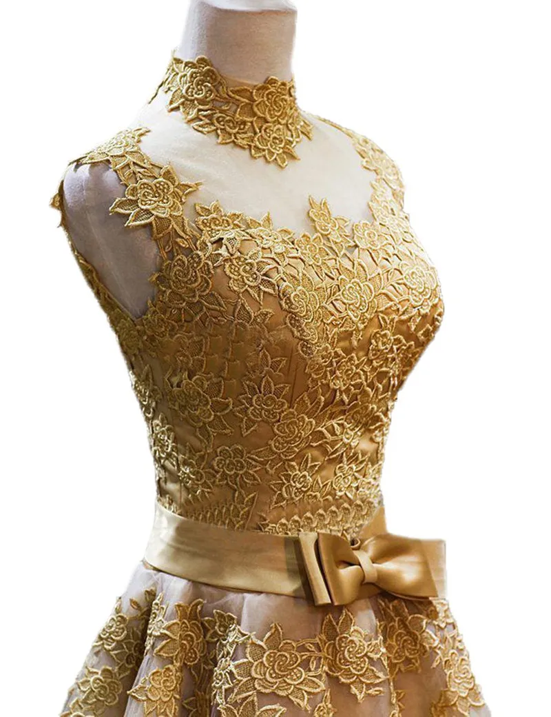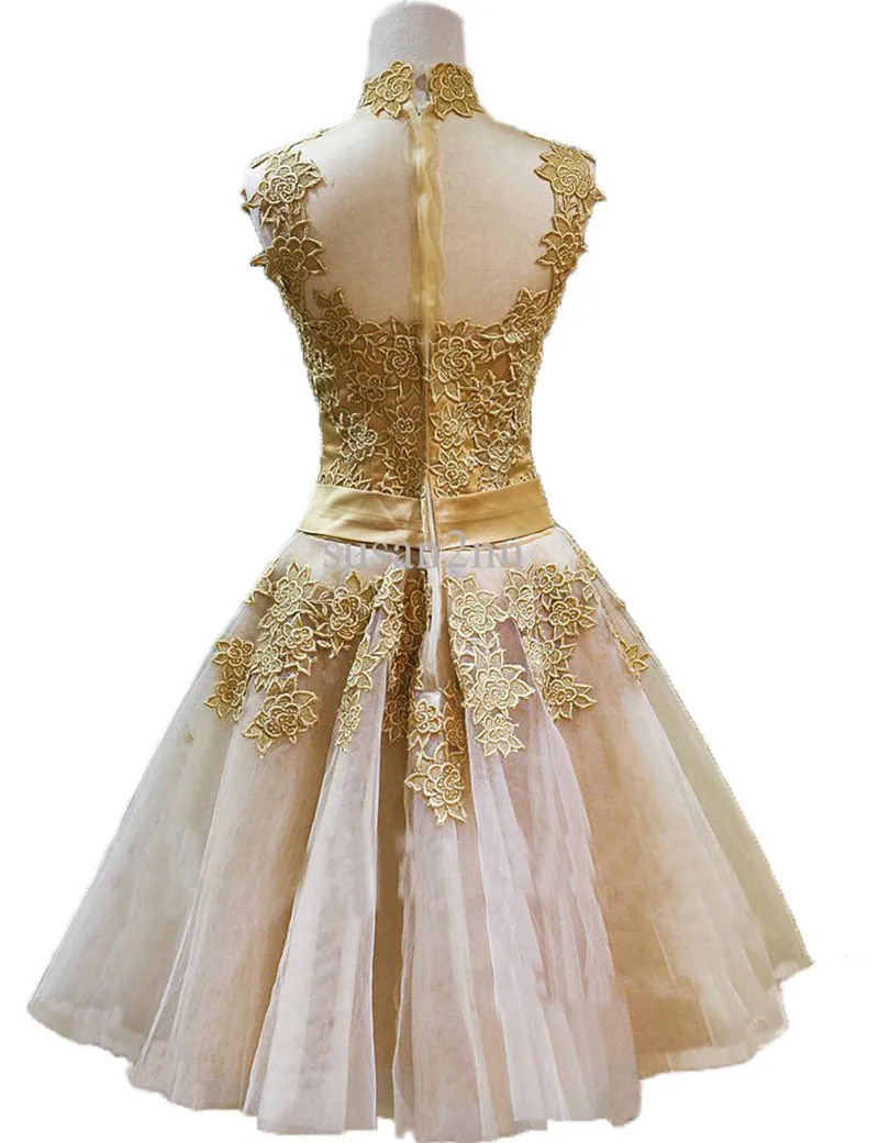 Fleepmart Robe De Soiree 2021 golden Short Lace Evening Dresses gowns Banquet Vintga High Neck vestido de festa Prom Dresses party dress