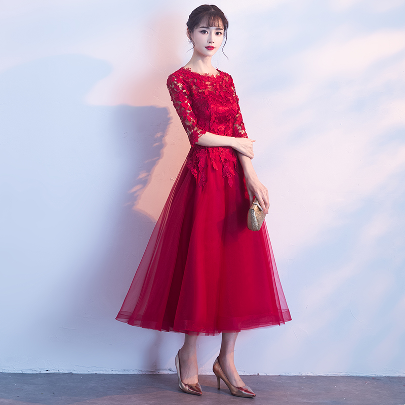 Fleepmart Robe de soiree Long Elegant Wine Red Lace O-Neck half sleeves Tulle evening dress A-Line vestido de festa party prom dresses