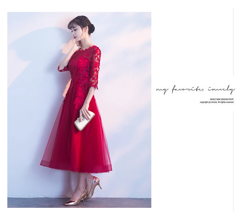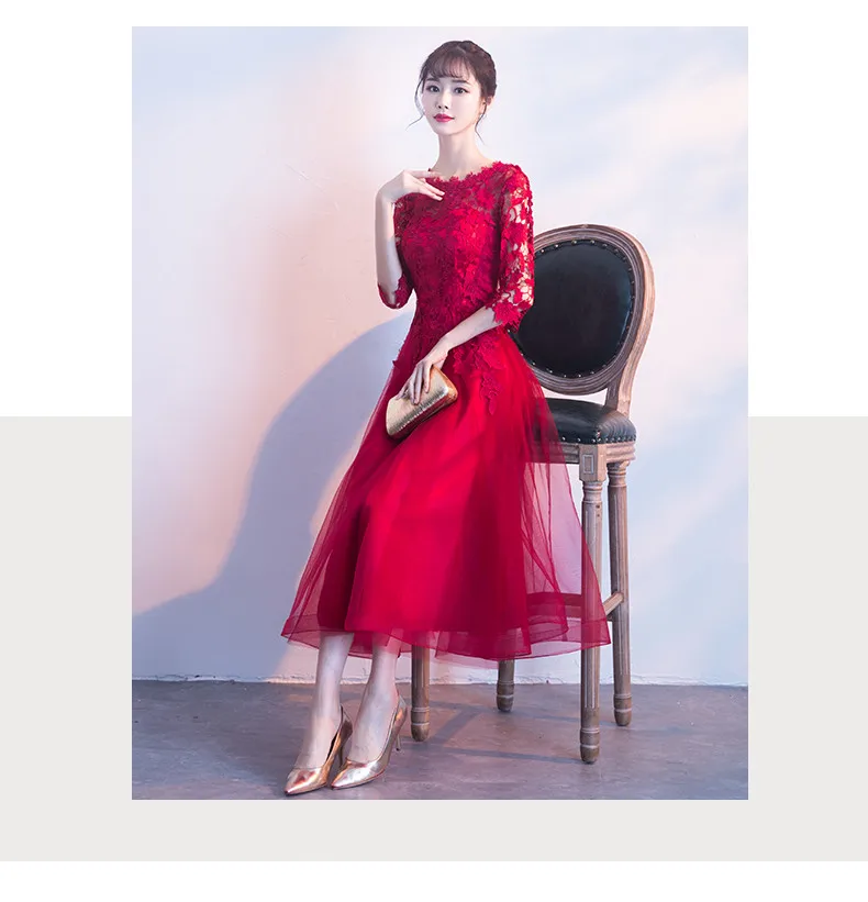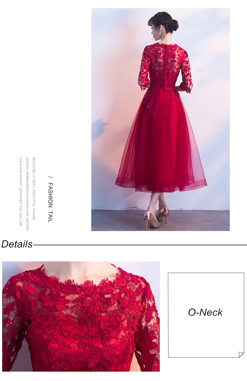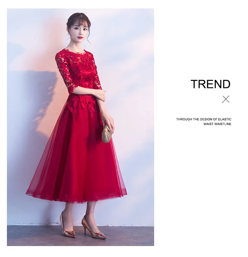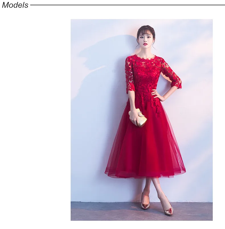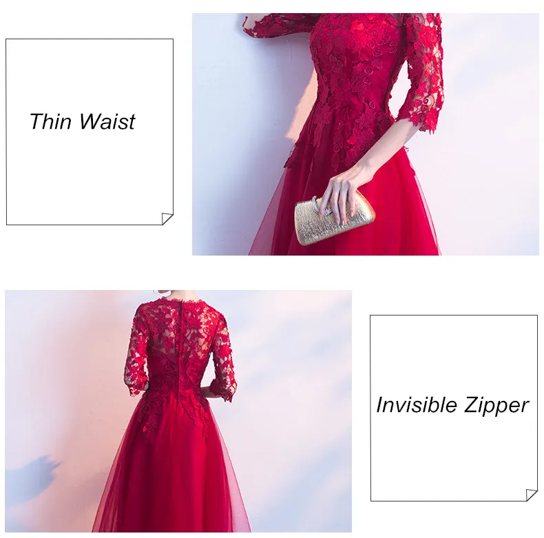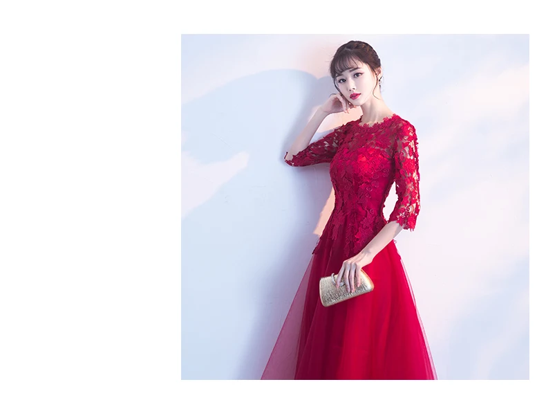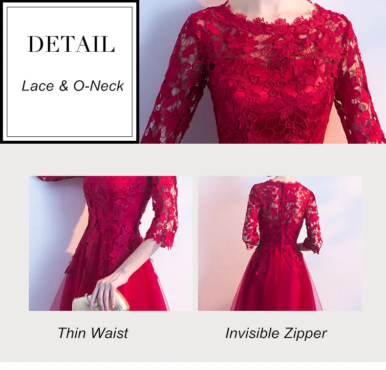 Fleepmart Robe de soiree Long Elegant Wine Red Lace O-Neck half sleeves Tulle evening dress A-Line vestido de festa party prom dresses