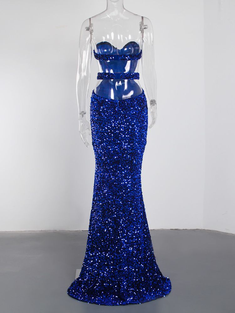 fleepmart Royal Blue Sparkles Stretch Sequin Strapless Floor Length Party Dress Padded Backless Split Evening Night Sleeveless Dress