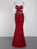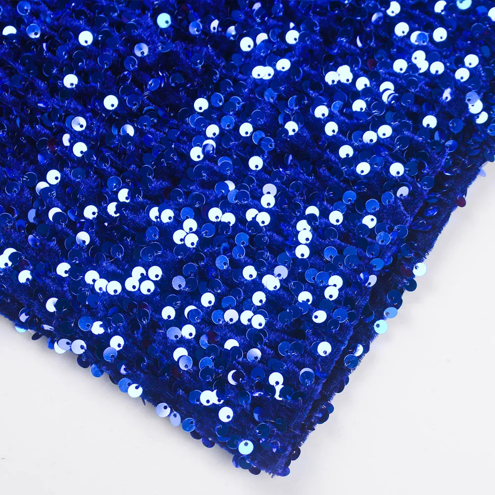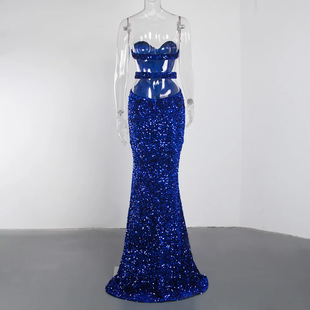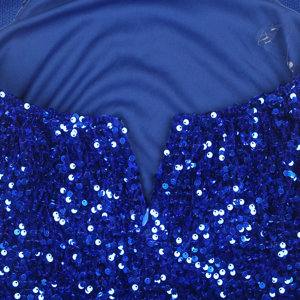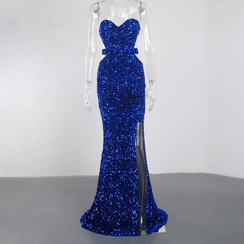 fleepmart Royal Blue Sparkles Stretch Sequin Strapless Floor Length Party Dress Padded Backless Split Evening Night Sleeveless Dress