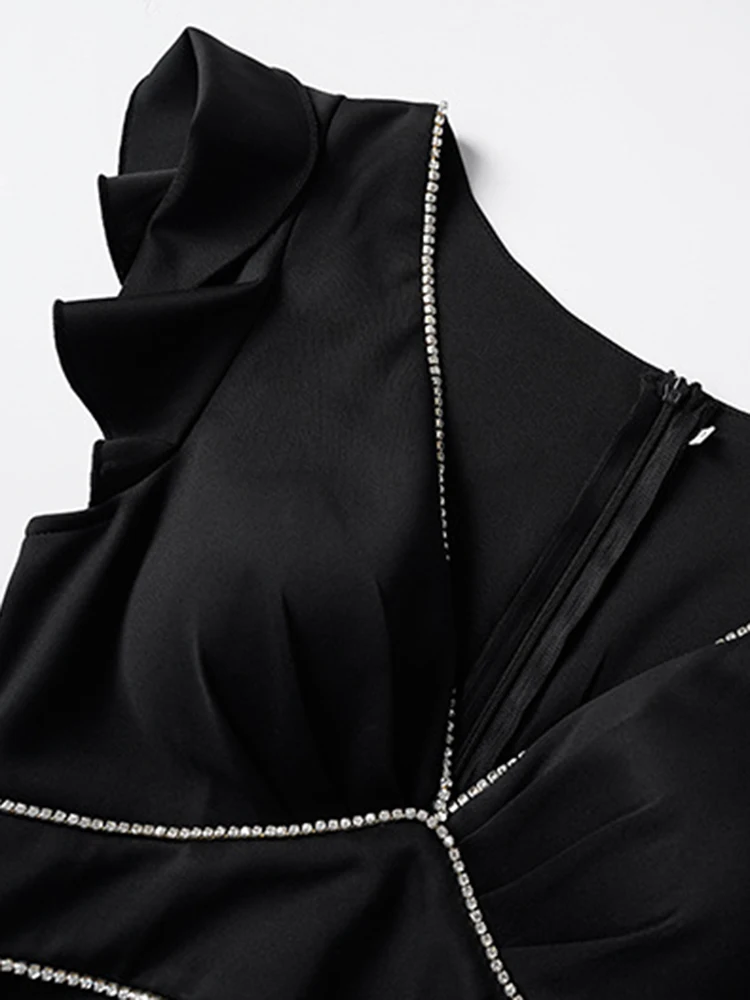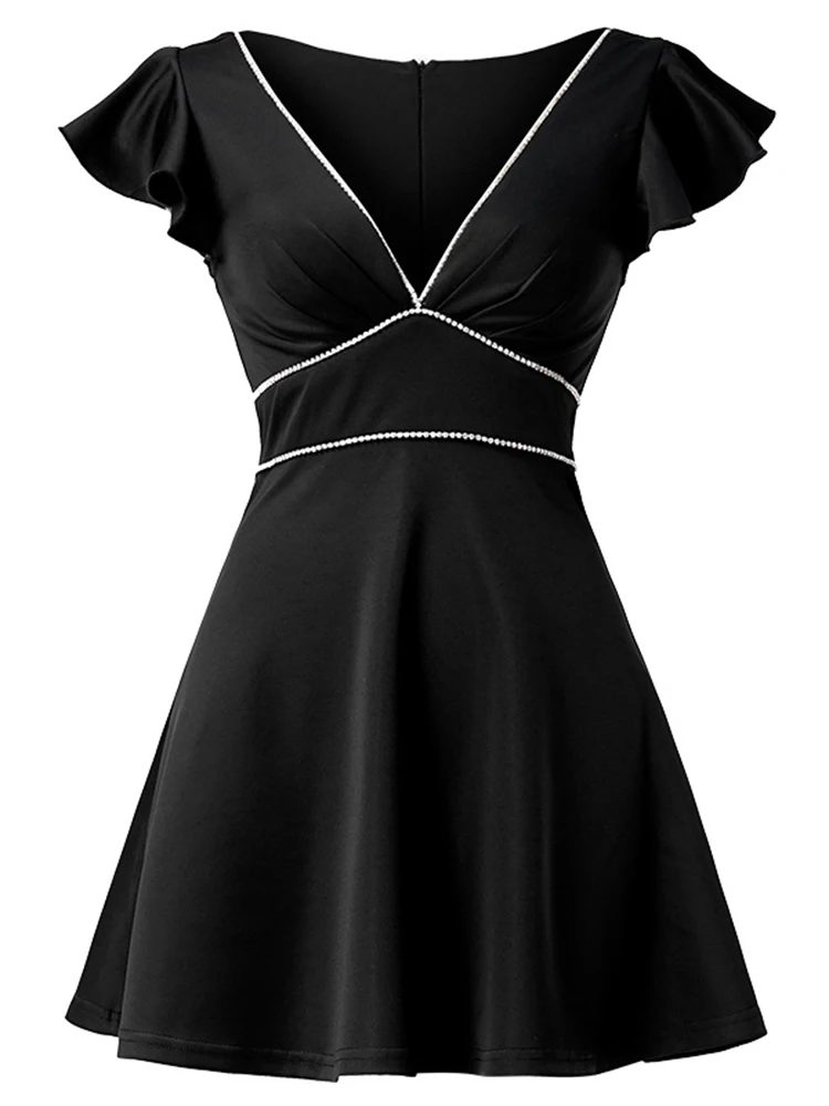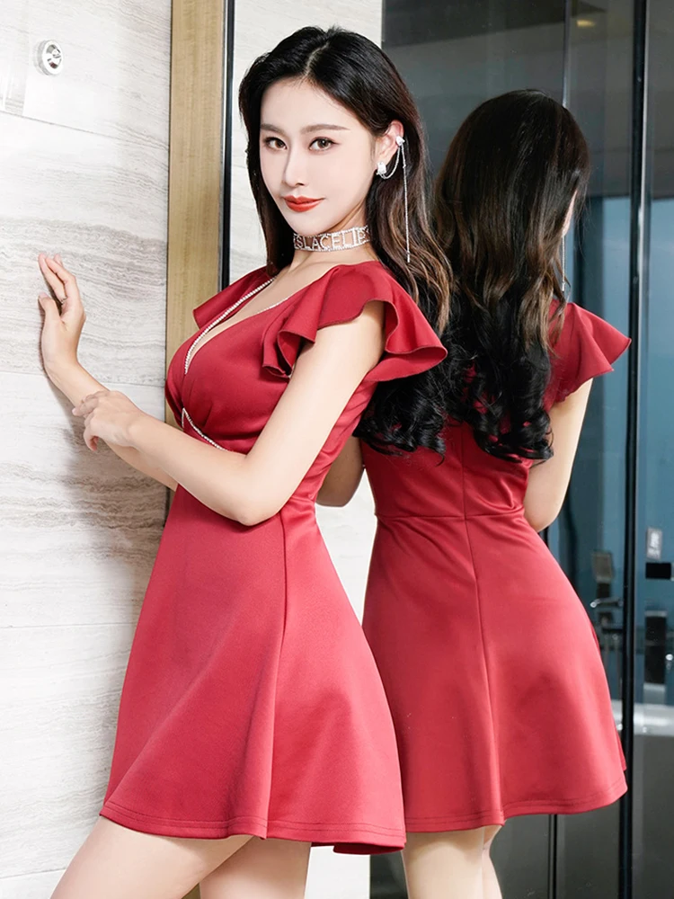 Fleepmart Ruffled Short Sleeve Sexy Mini Night Evening Dress Deep V-neck A-line Taffta Club Lady Dresses Black Red Party Prom Gowns