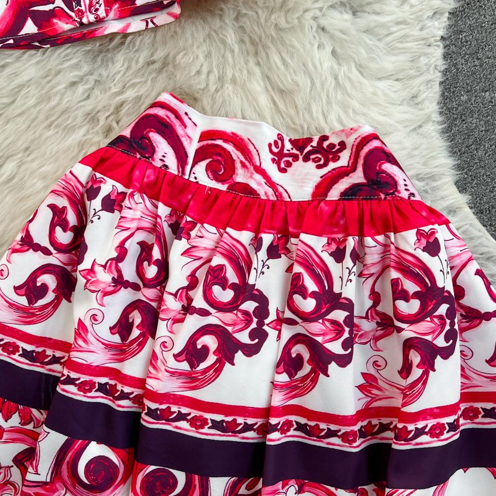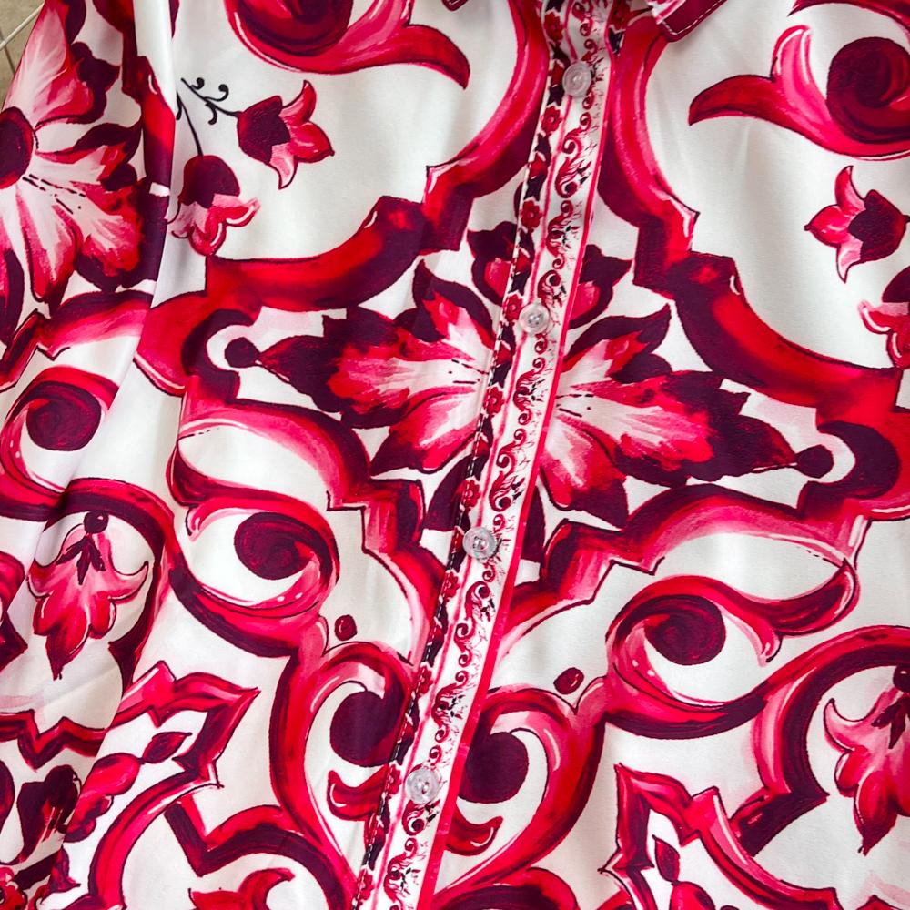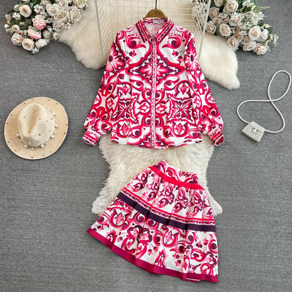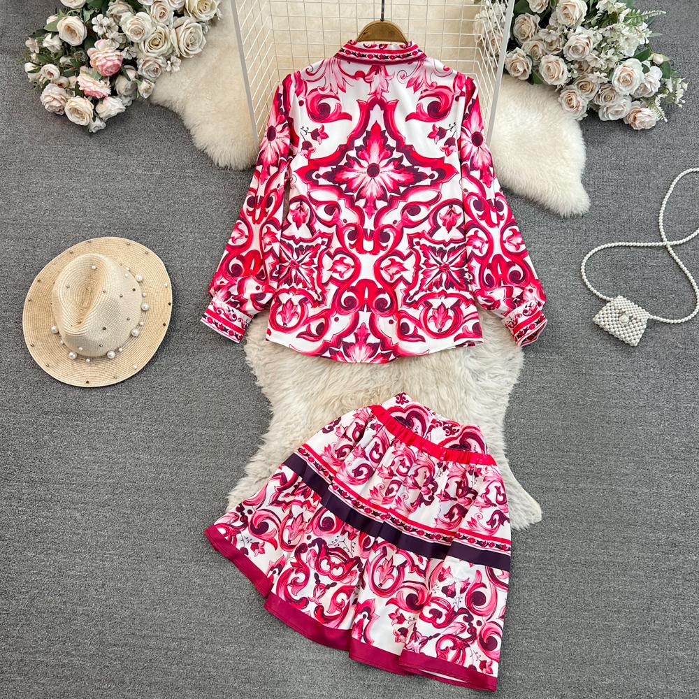 Fleepmart Runway Red Blue And White Porcelain Print Long Sleeve Bouses And Skirt Suit High Waist Red Flower Print Party Holiday Set