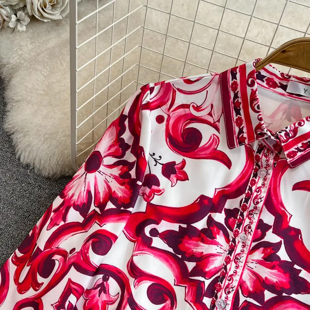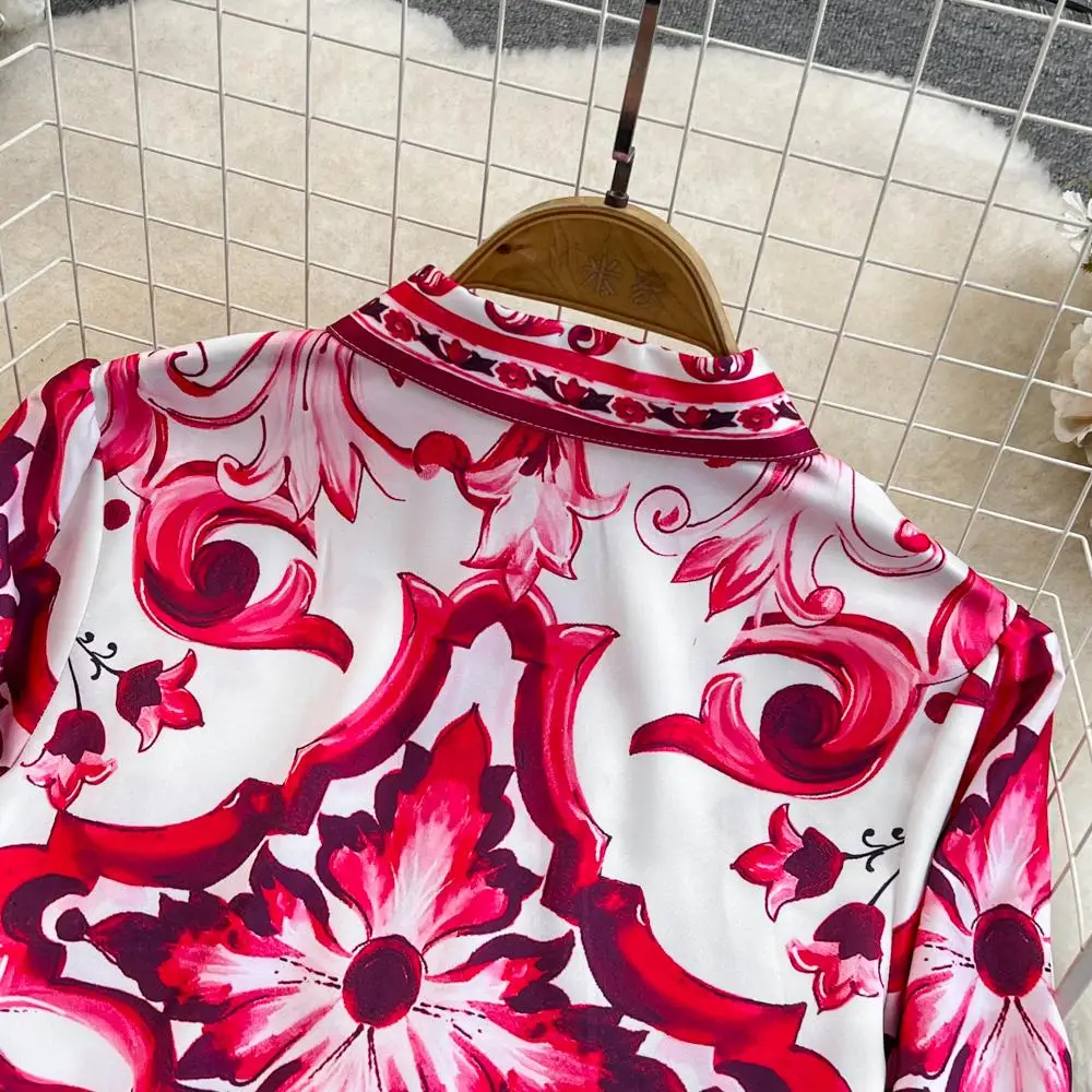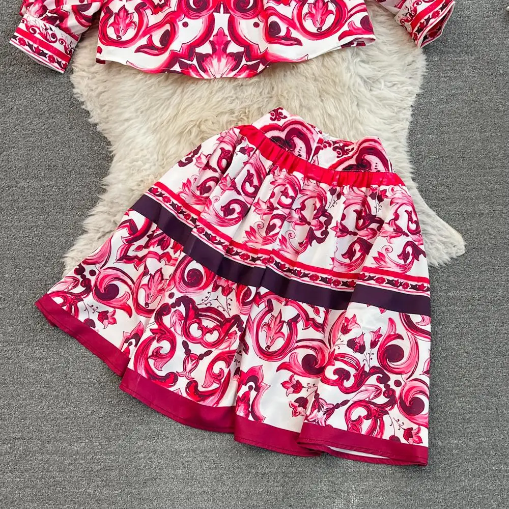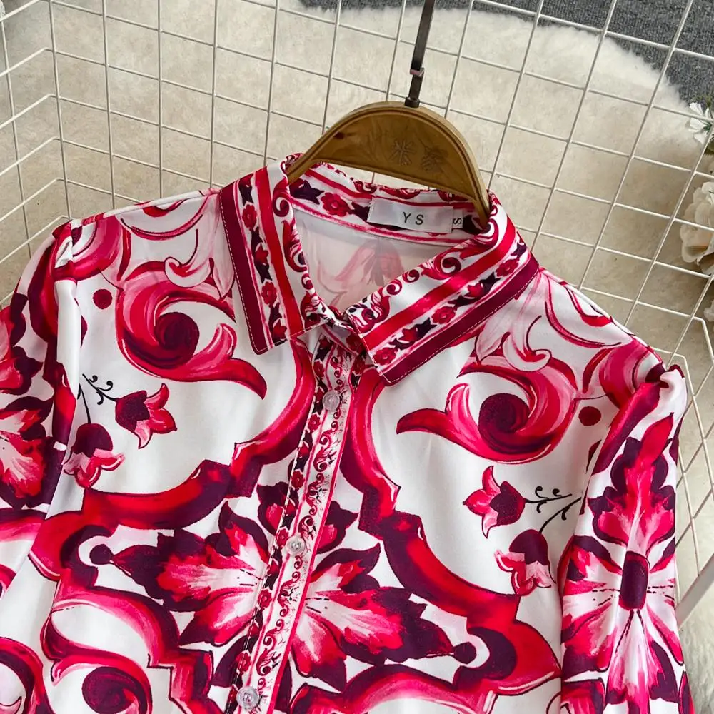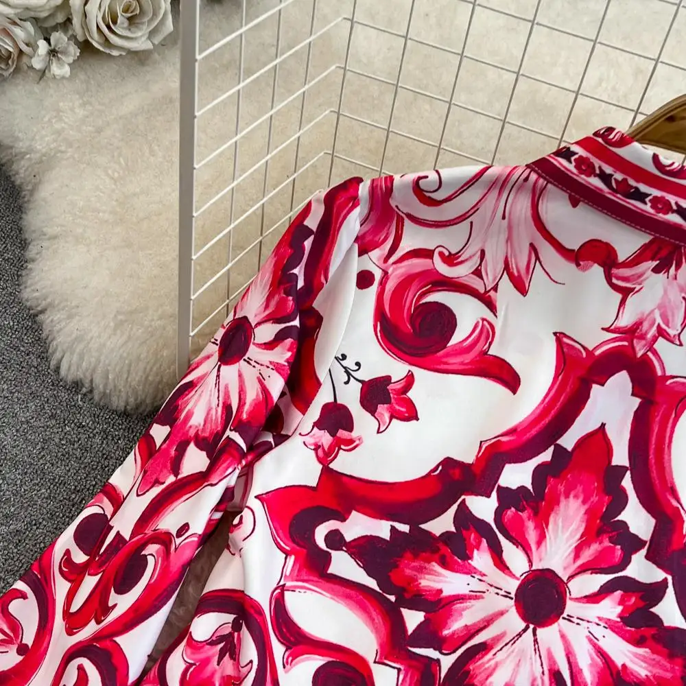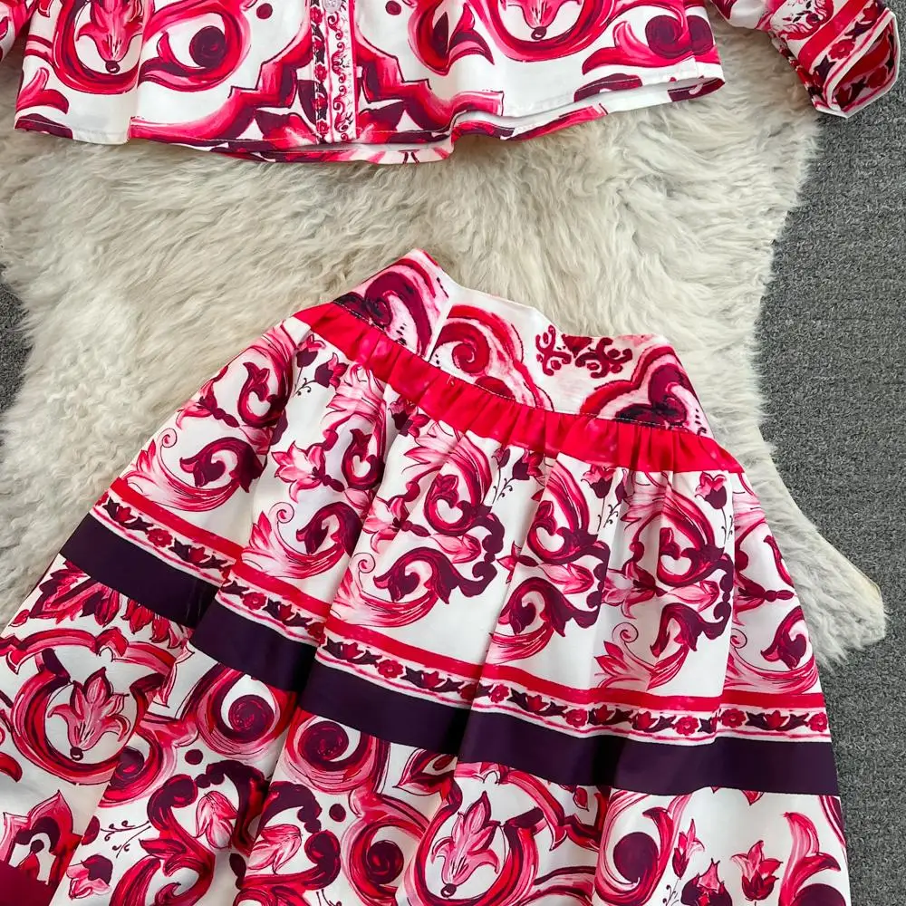 Fleepmart Runway Red Blue And White Porcelain Print Long Sleeve Bouses And Skirt Suit High Waist Red Flower Print Party Holiday Set