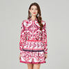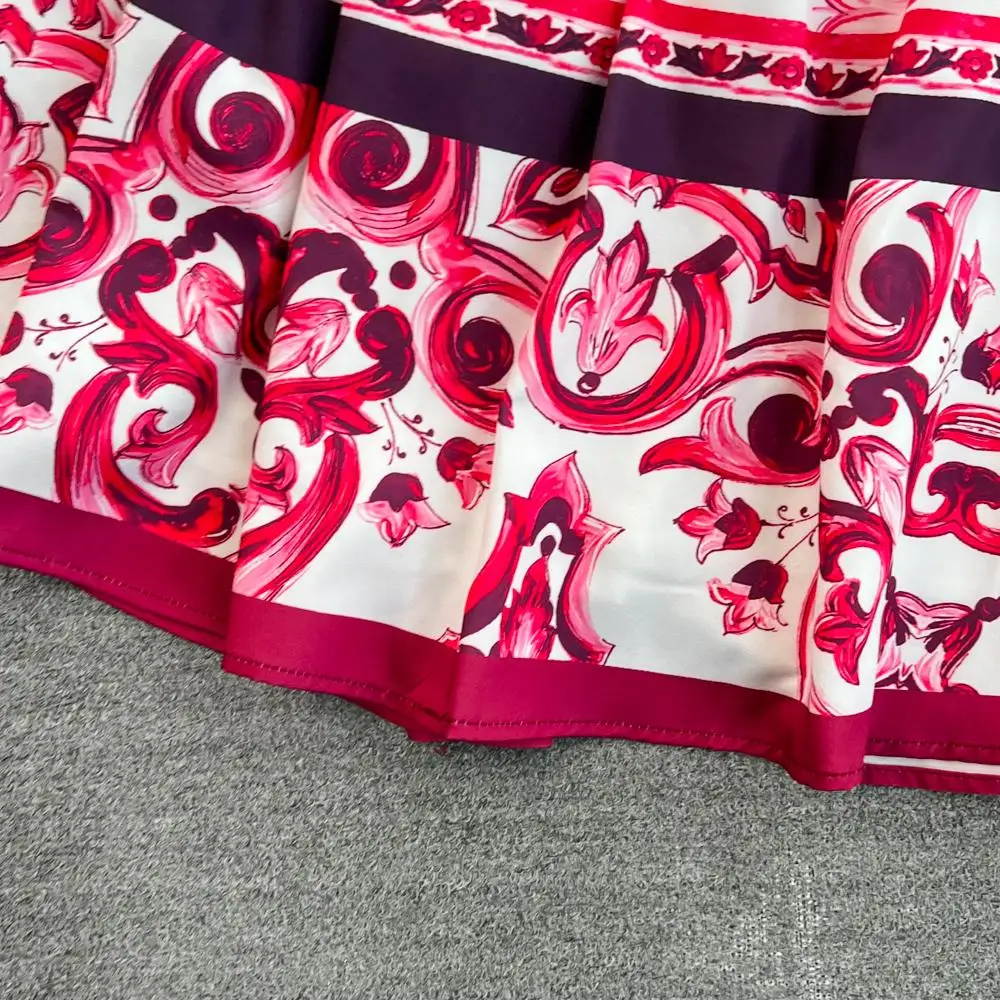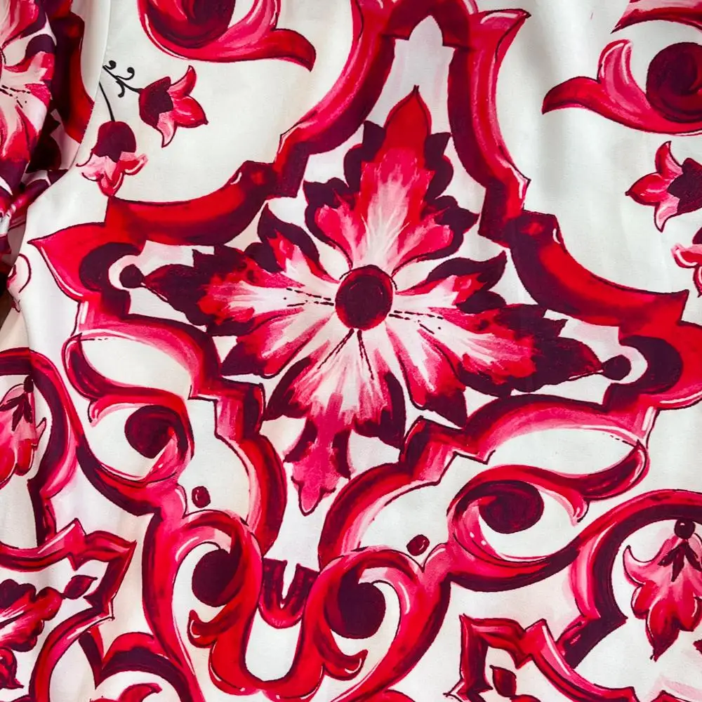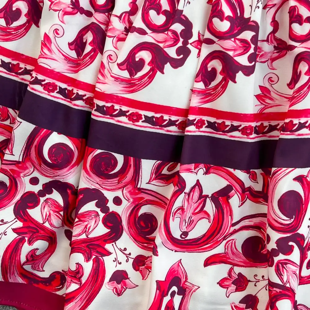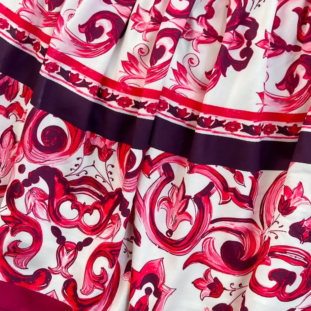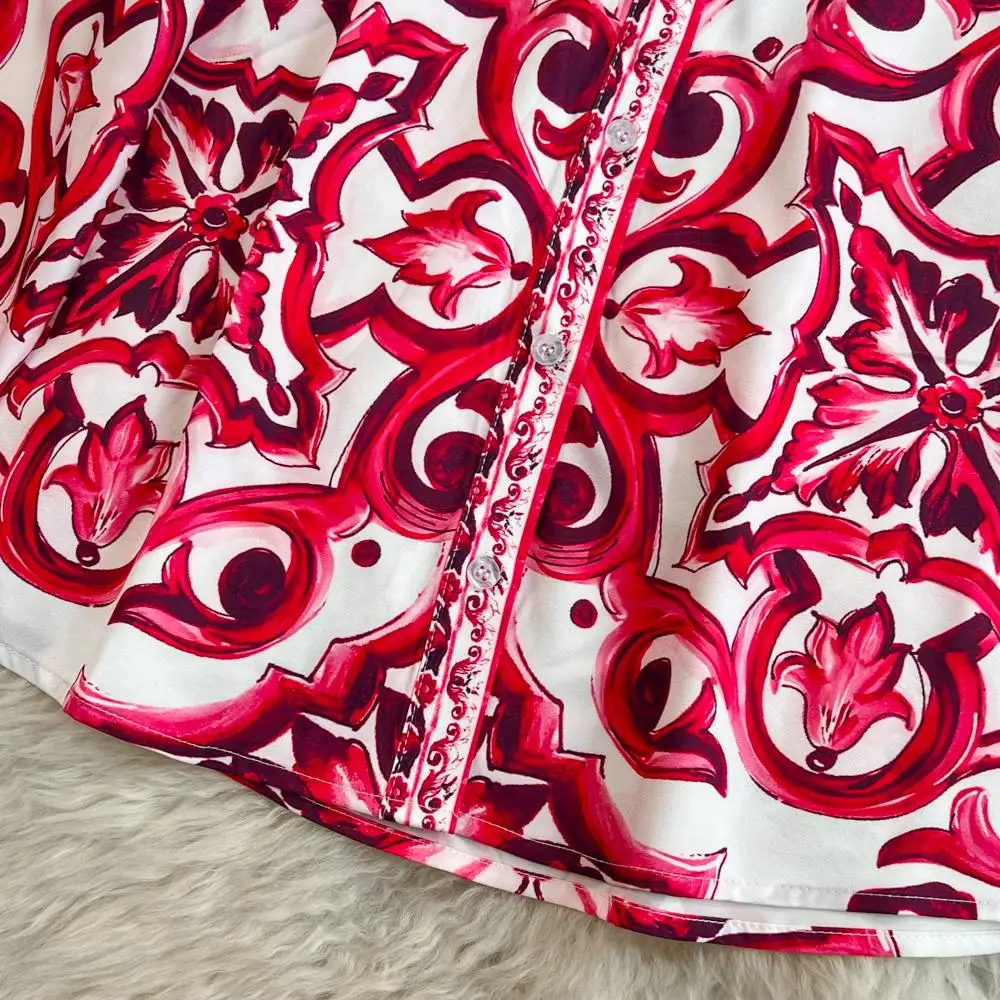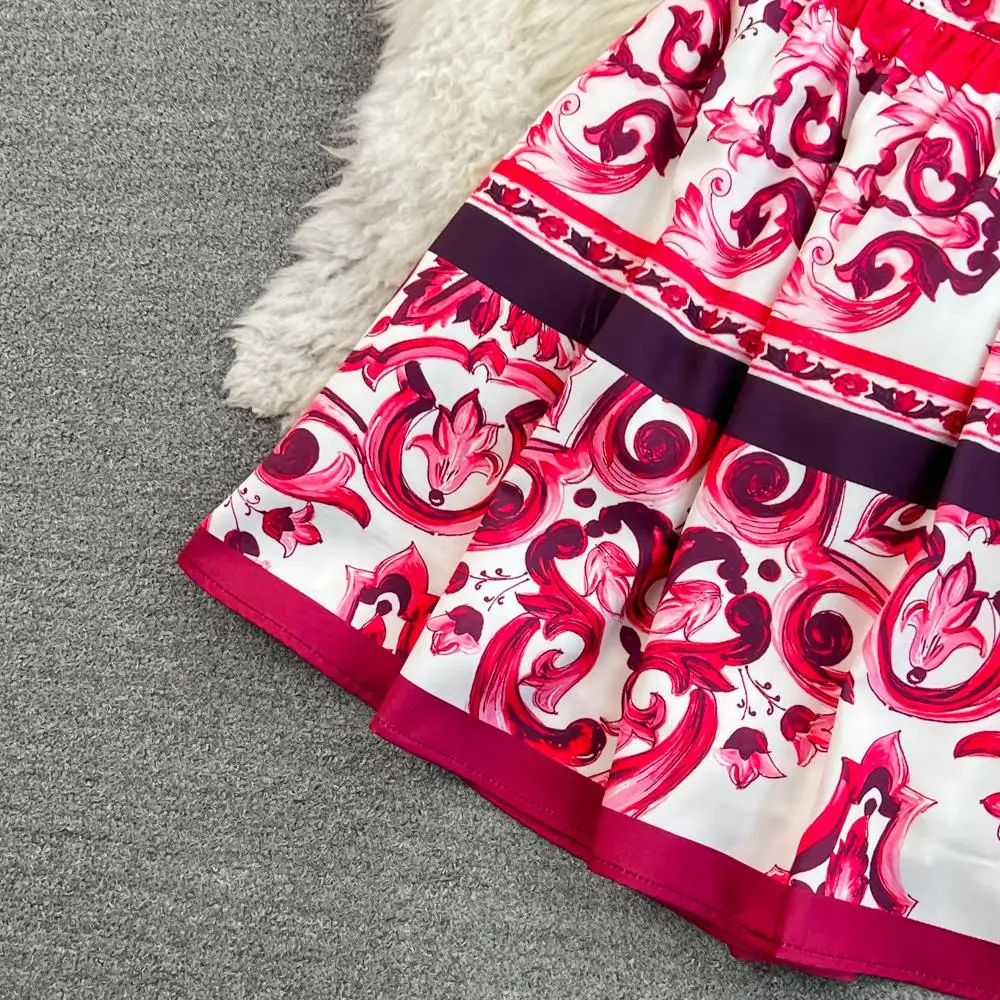 Fleepmart Runway Red Blue And White Porcelain Print Long Sleeve Bouses And Skirt Suit High Waist Red Flower Print Party Holiday Set