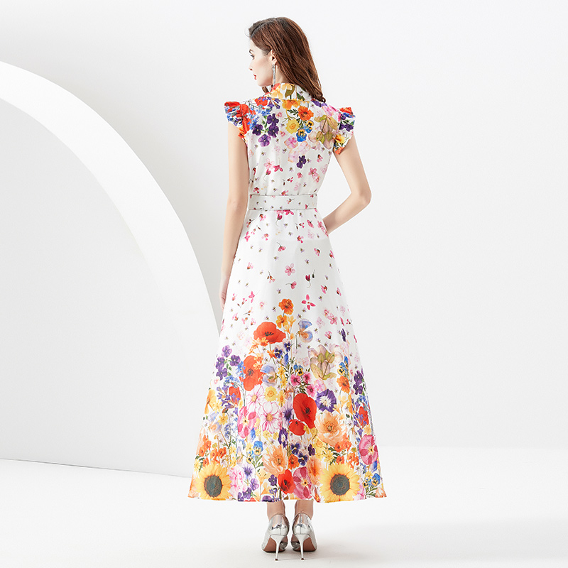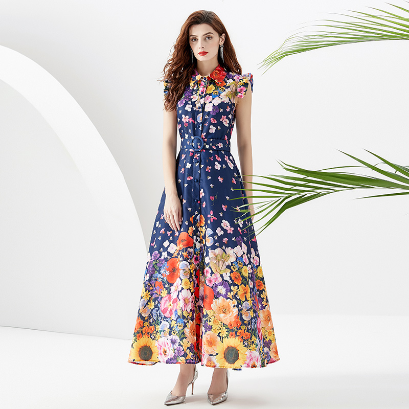 Fleepmart Runway Summer Holiday Maxi Dress Women Clothing Sleeveless Sleeve Single Breasted Floral Print Belt Long Robe