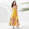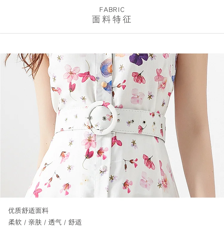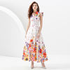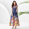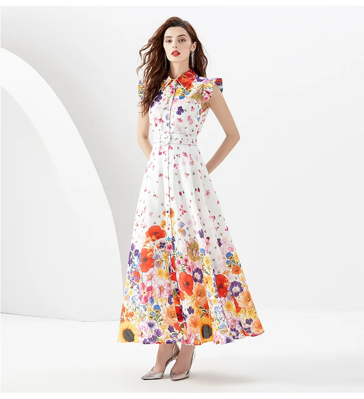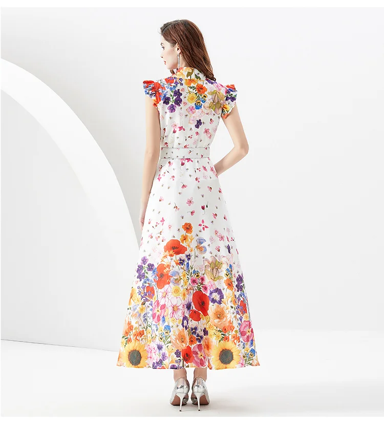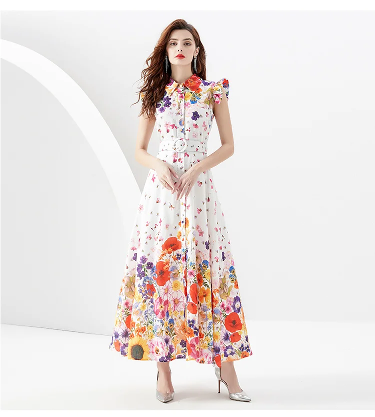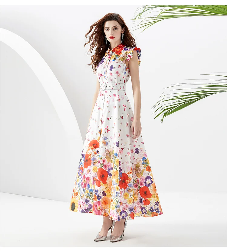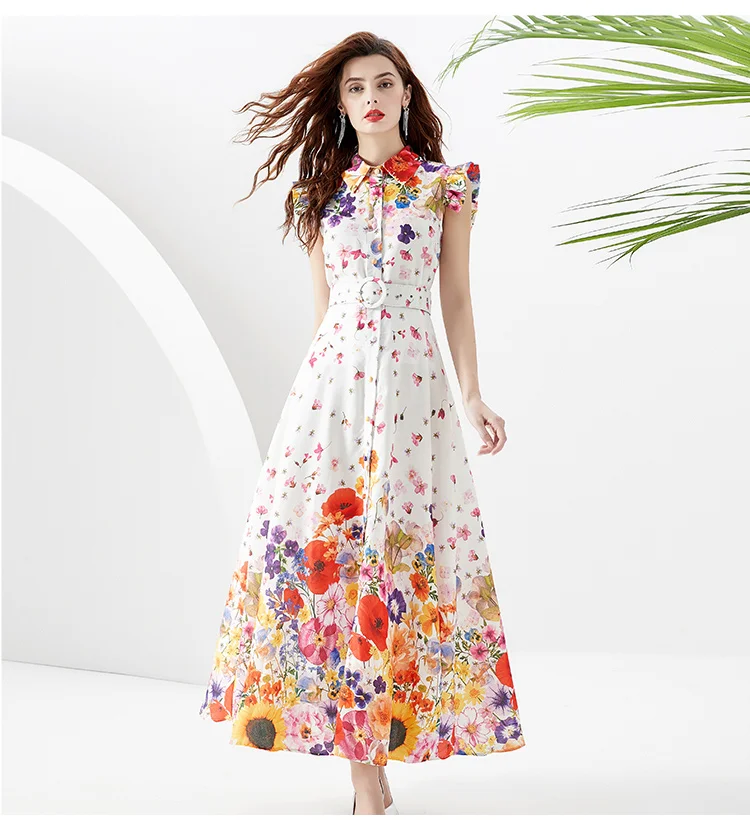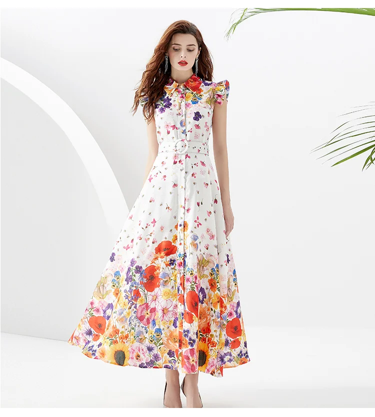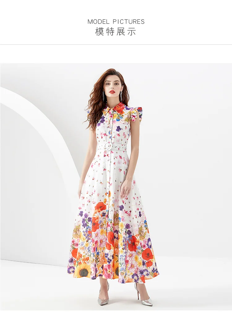 Fleepmart Runway Summer Holiday Maxi Dress Women Clothing Sleeveless Sleeve Single Breasted Floral Print Belt Long Robe