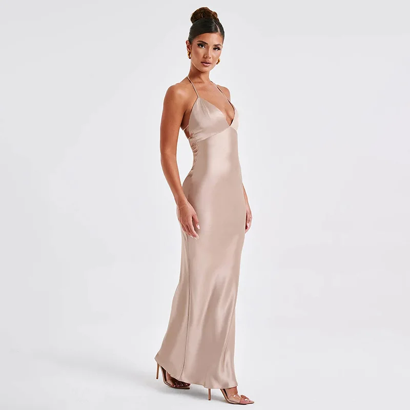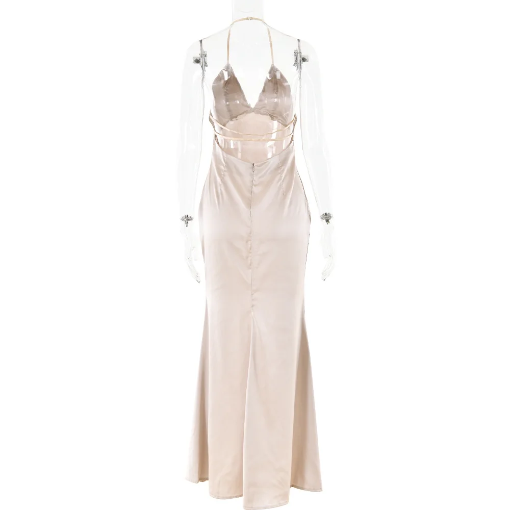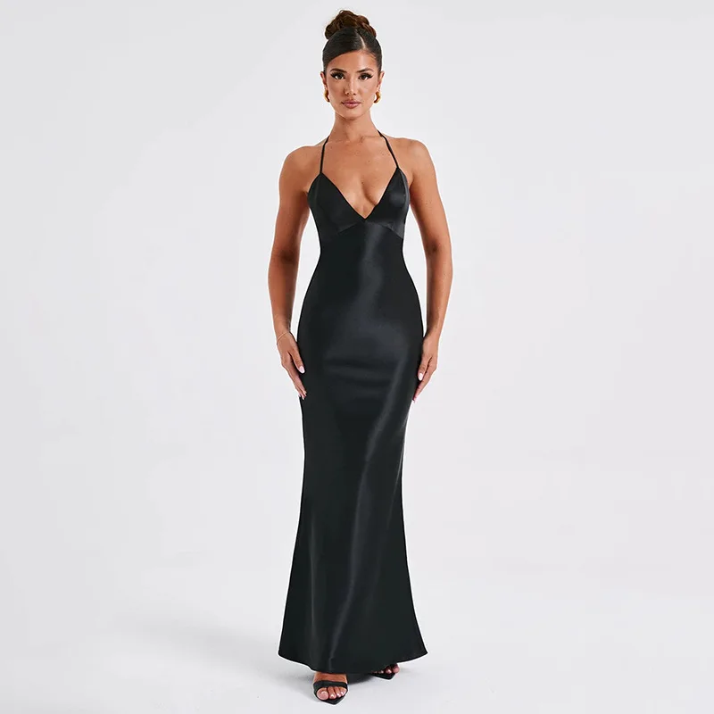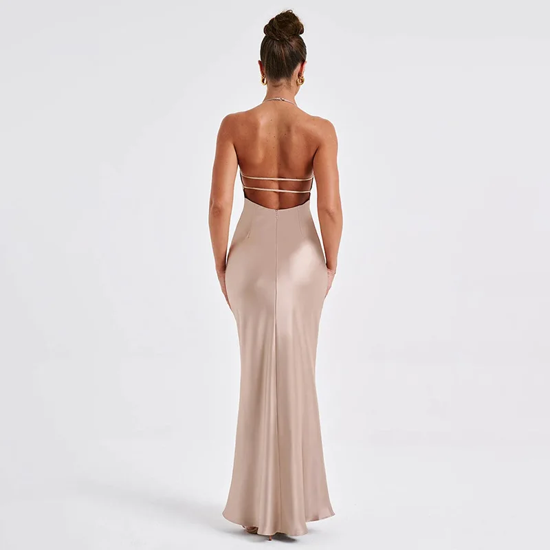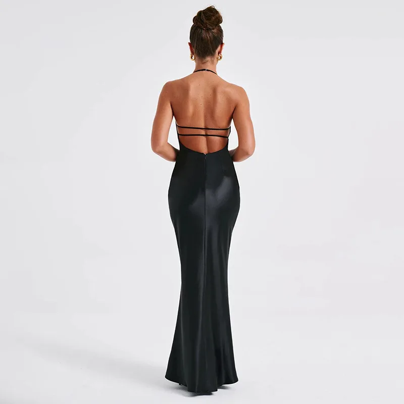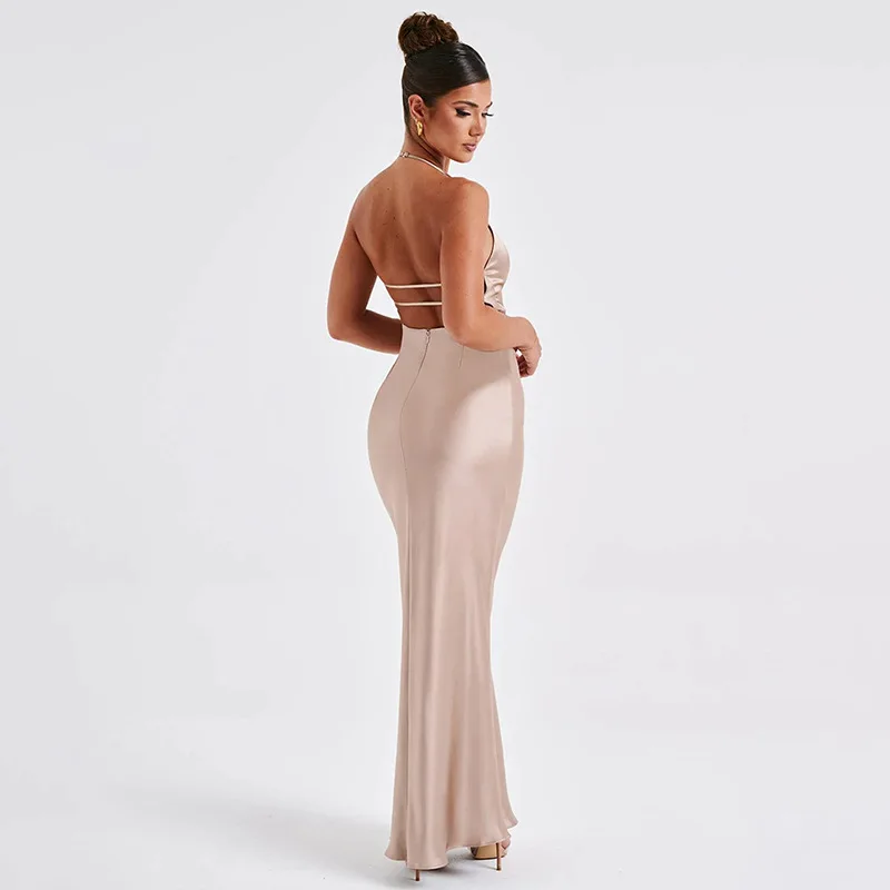Fleepmart Satin Backless Party Maxi Dress For Women Spaghetti Strap Sleeveless Feathers Bodycon Long Dress Vestido Clubwear