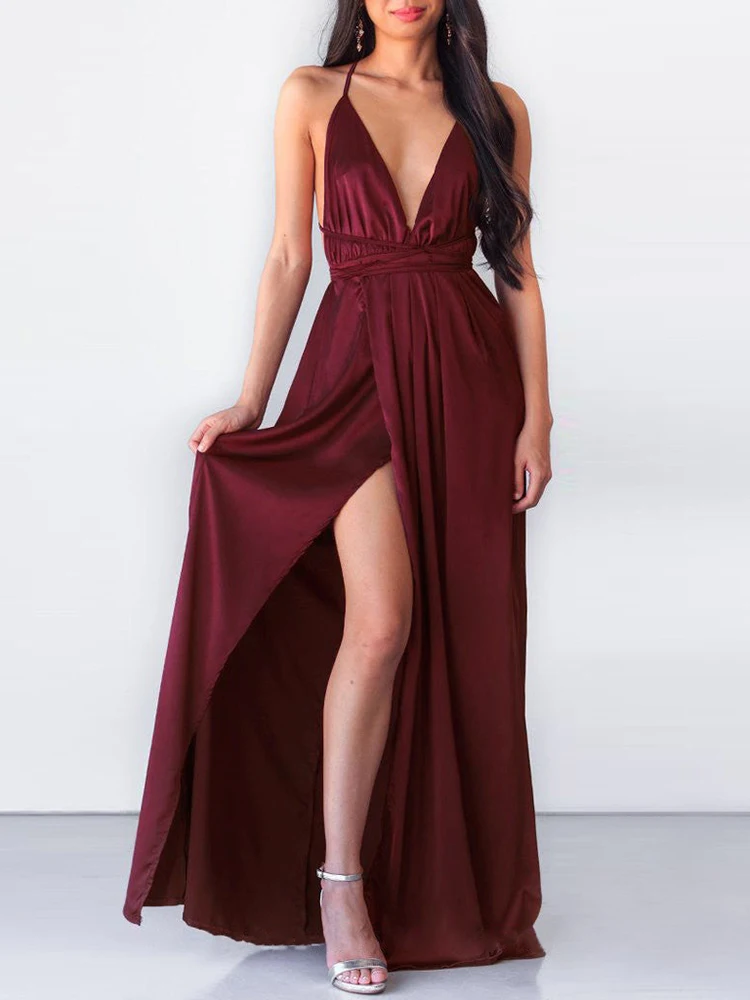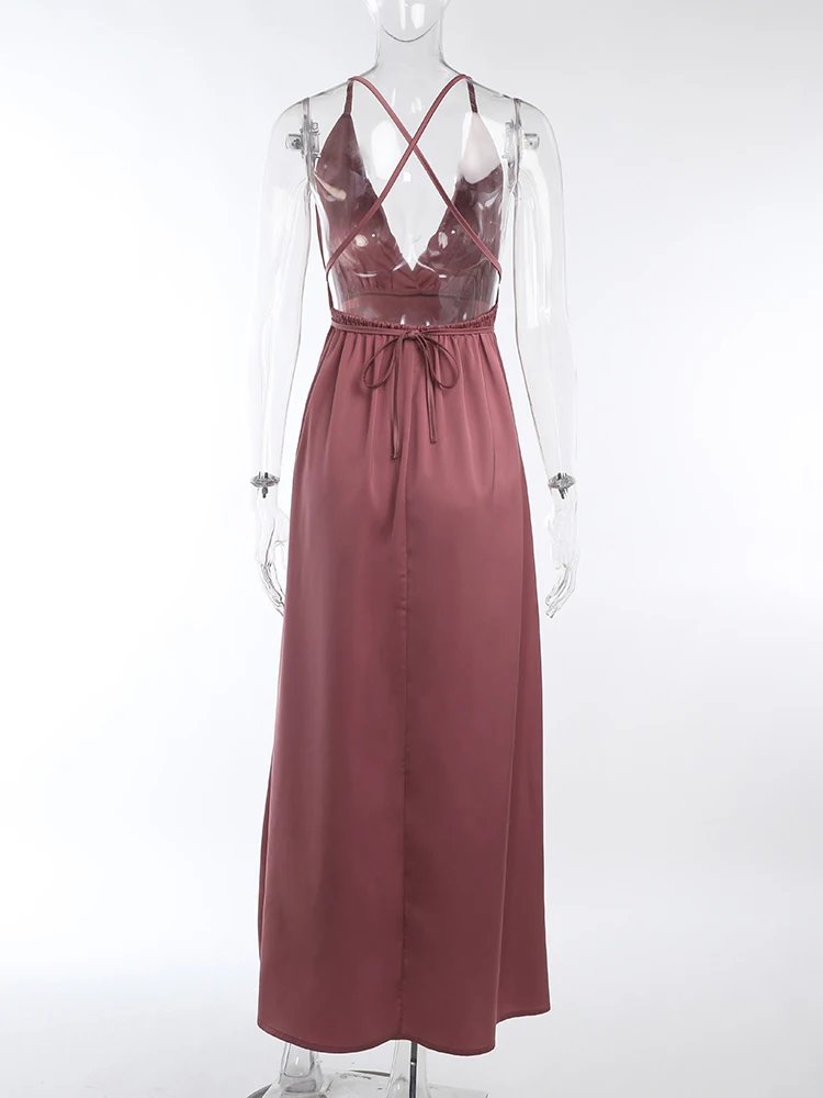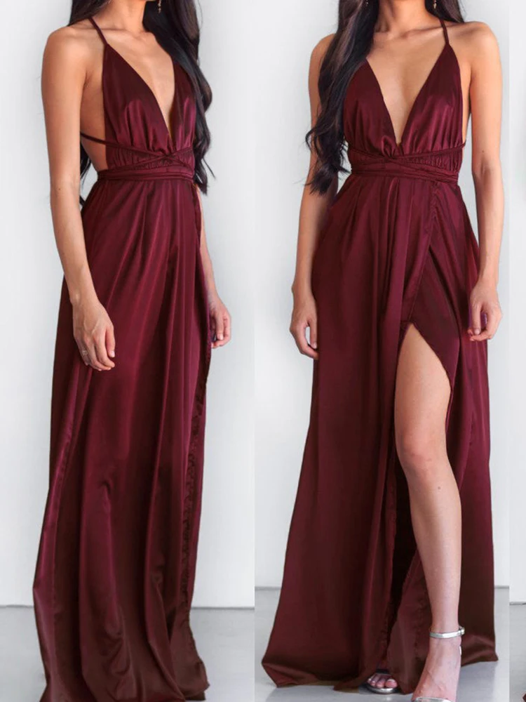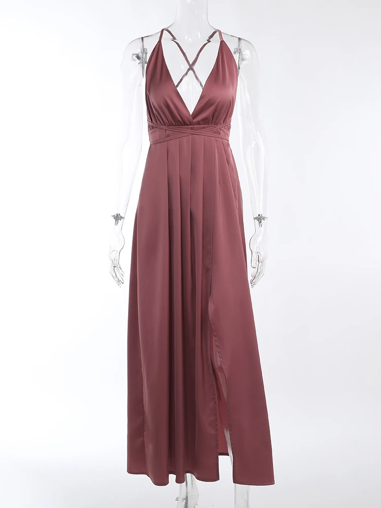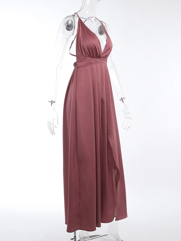 Fleepmart Satin Slit Cami Long Dress Backless Deep V Neck Bandage Summer Sleeveless Sexy Elegant Party Streetwear Female Clothing
