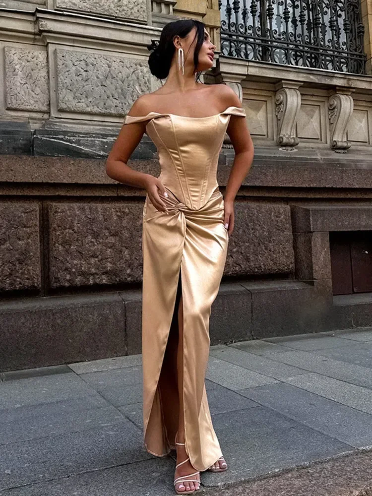 Fleepmart Satin Strapless Thigh High Split Maxi Dress for Women Solid Off-shoulder Backless Sleeveless Bodycon Fashion Long Dress