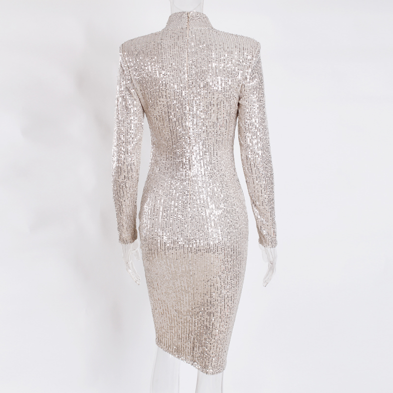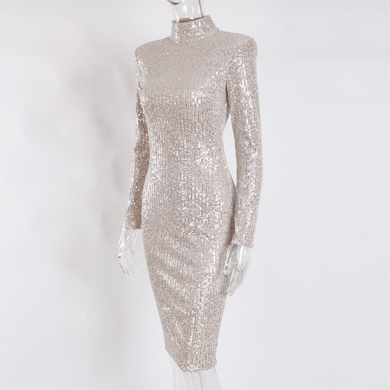 Fleepmart Sequined High Collar Midi Dress Elegant Long Sleeve Bodycon Tight Stretch Knee Length Party Dresses